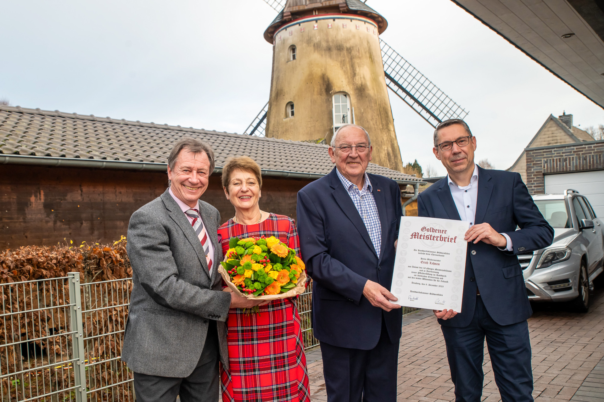 Die Geschichte unterstreicht Lehnens Liebe zu seinem Handwerk und zu seiner Heimat. Er ist geboren und aufgewachsen in Brüggen-Bracht und betreibt seit Jahrzehnten mit seiner Frau Maria die Bäckerei an der Straße Hülst mit einer Filiale in Born und einem Café in der Brachter Mühle, wo er als Ehren-Standesbeamter Paare verheiratet. Lehnen ist Vorsitzender des Mühlenvereins, und so passte es gut, dass er seinen Goldenen Meisterbrief im Schatten der Mühle entgegennahm. Obermeister Rudolf Weißert von der Niederrheinischen Bäcker-Innung und Geschäftsführer Marc Goxers von der Kreishandwerkerschaft Niederrhein überreichten die Auszeichnung.