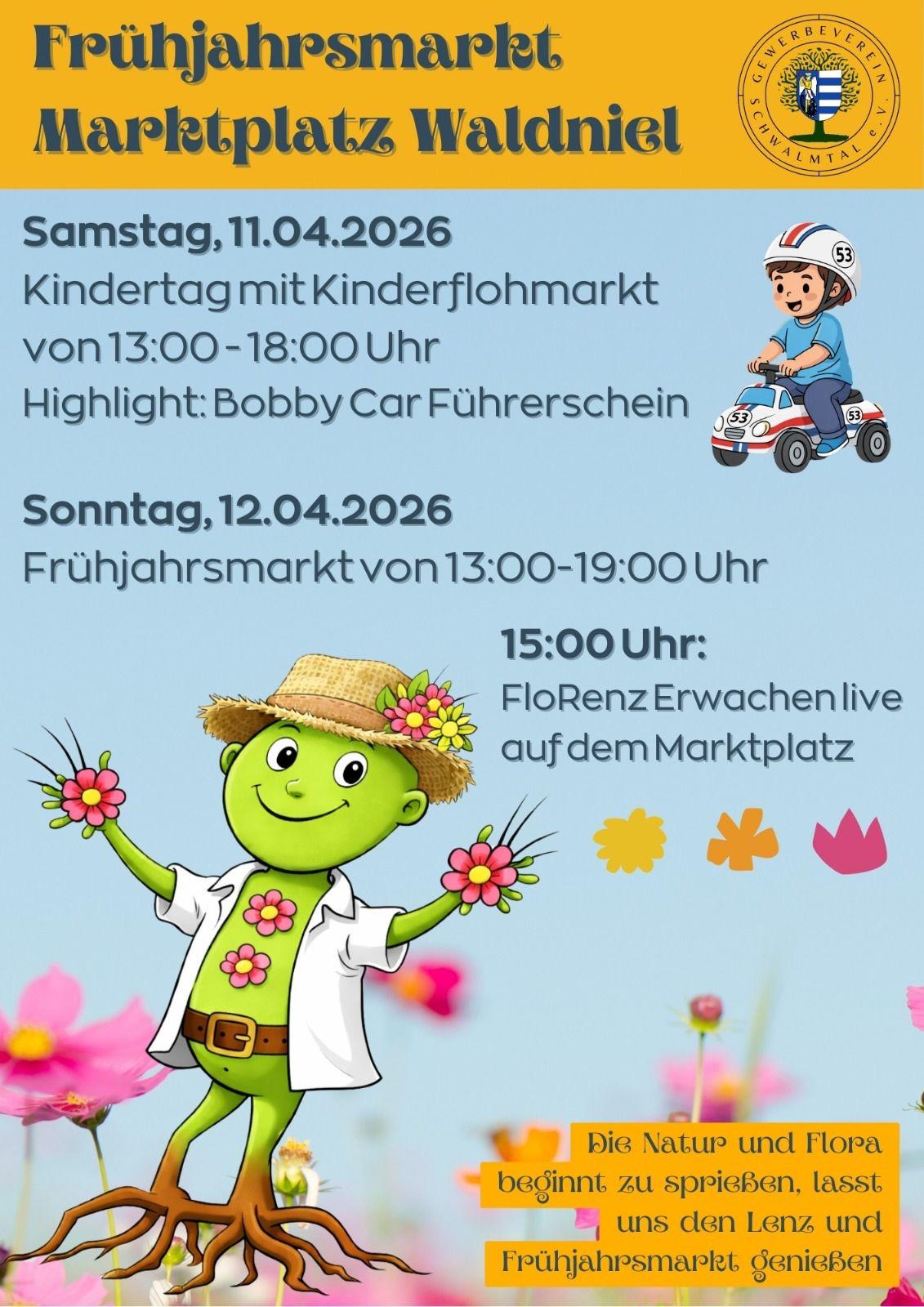 Der Frühling hält Einzug in Waldniel und mit ihm ein Wochenende voller Herz, Begegnung und besonderer Momente. Am 11. und 12. April 2026 lädt der Gewerbeverein Schwalmtal e.V. zum Frühjahrsmarkt auf den Marktplatz in Waldniel ein.