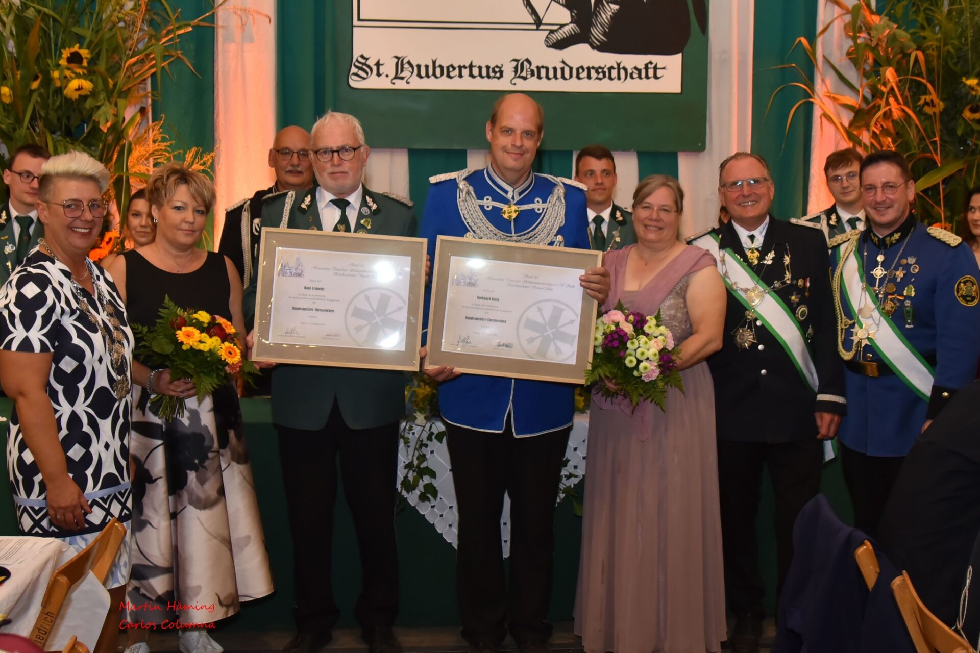 Ein feierlicher Höhepunkt des Abends war die Auszeichnung zweier verdienter Mitglieder: Burkhard Klein und Hans Lennertz erhielten das Bundesmeister-Ehrenzeichen – eine hohe Würdigung für jahrzehntelanges Engagement und herausragende Verdienste in der Bruderschaft.