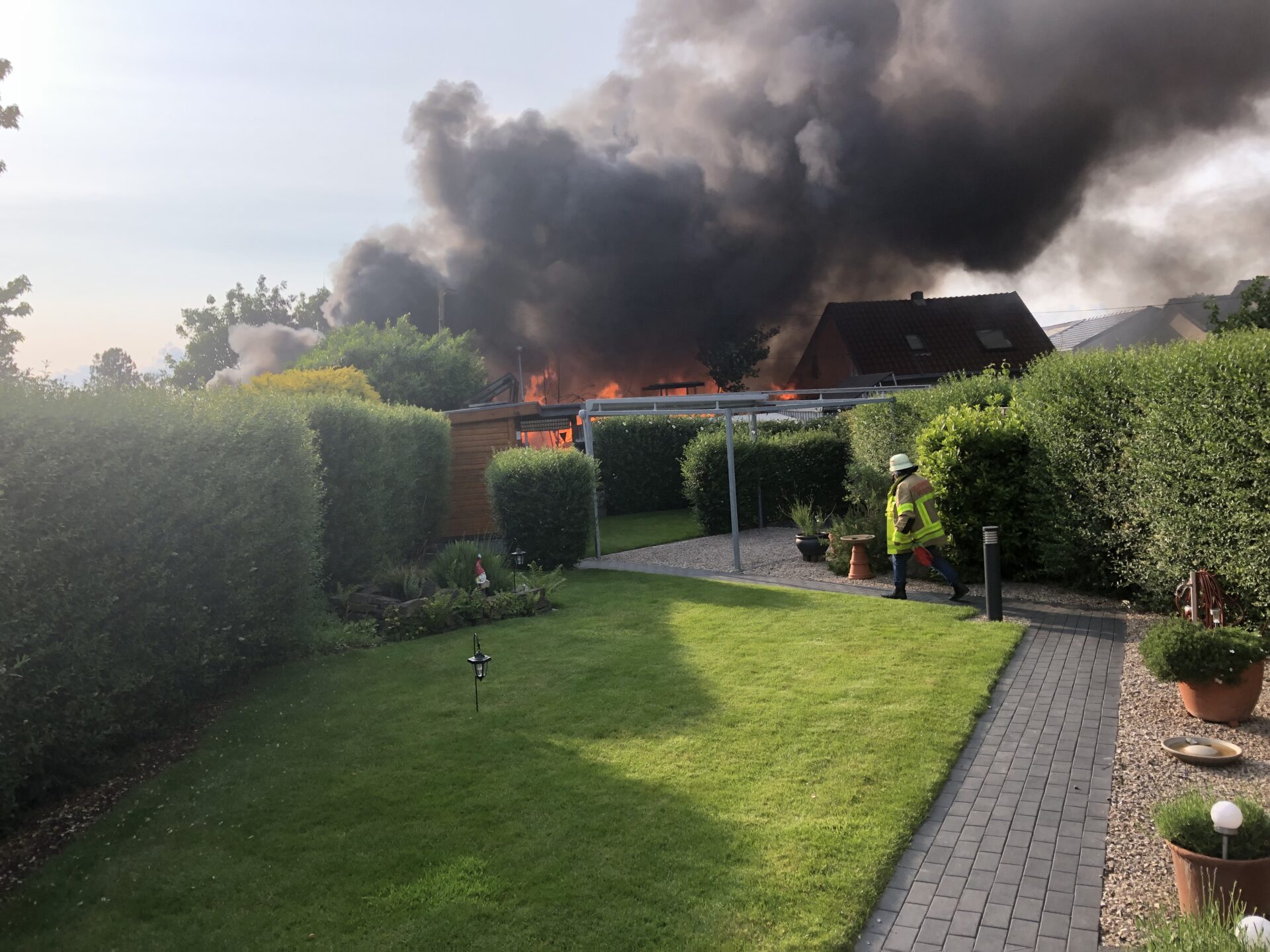 Aufgrund der massiven Rauchentwicklung und des niederschlagenden Rußes wurde die Bevölkerung über die Warn-App Nina aufgefordert, Türen und Fenster geschlossen zu halten und den Aufenthalt im Freien zu vermeiden. Die Bewohner des Hauses konnten sich rechtzeitig in Sicherheit bringen. Eine Polizistin zog sich leichte Verletzungen zu. Nach rund einer Stunde konnte das Feuer unter Kontrolle gebracht werden. Zur Vermeidung von Glutnestern legte die Feuerwehr vorsorglich einen Schaumteppich aus. Auch ein kleiner Entstehungsbrand im Dachbereich eines benachbarten Hauses wurde frühzeitig erkannt und gelöscht.