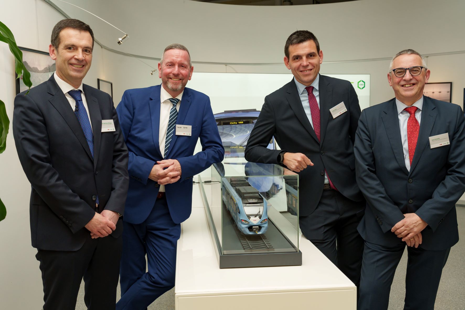„Die neuen Fahrzeuge werden sauber, leise, komfortabel und zuverlässig sein“, freut sich Görtz, der über sein Engagement bei Europas großem Verkehrsverbund (VRR) an diesem Projekt mitgewirkt hat. Görtz traf bei der Vertragsunterzeichnung in Kempen auf die Unternehmensspitze von CAF – angeführt vom CEO Javier Martinez Ojinaga (links im Bild). Das Niederrhein-Münsterland-Netz ist das erste SPNV-Netz in NRW mit alternativem Antrieb und das größte dieser Art in ganz Deutschland. (opm)