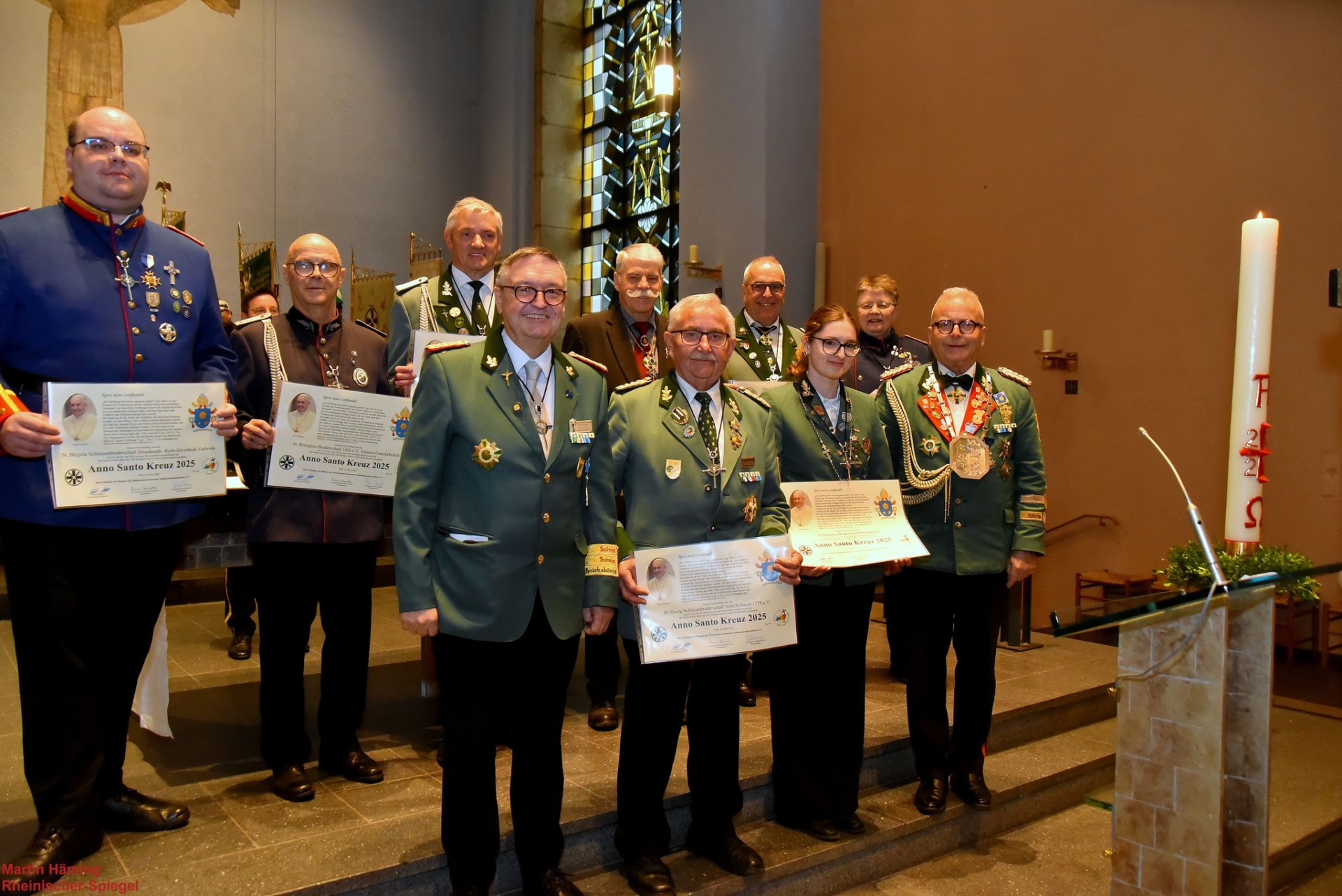 Geehrt wurden die Schützenbruderschaft vom Heiligsten Sakrament des Altares Hückelhoven e.V., die St. Brigitta Schützenbruderschaft Blonderath-Ryth-Silverbeek-Vabrook, die St. Georg Schützenbruderschaft Schellerbaum 1779 e.V., die St. Pankratius Bruderschaft Amern St. Anton, die St. Hubertus Bruderschaft Oberbeberich, die St. Remigius Bruderschaft 1663 e.V. Viersen-Unterbeberich, die St. Petri Schützenbruderschaft von 1753 Viersen-Hoser e.V. sowie die St. Konrad Schützengilde Grenzweg e.V. Mit der Übergabe des Kreuzes wurde ihr gemeinsamer Weg nach Rom noch einmal sichtbar gemacht und in den kirchlichen Zusammenhang gestellt.