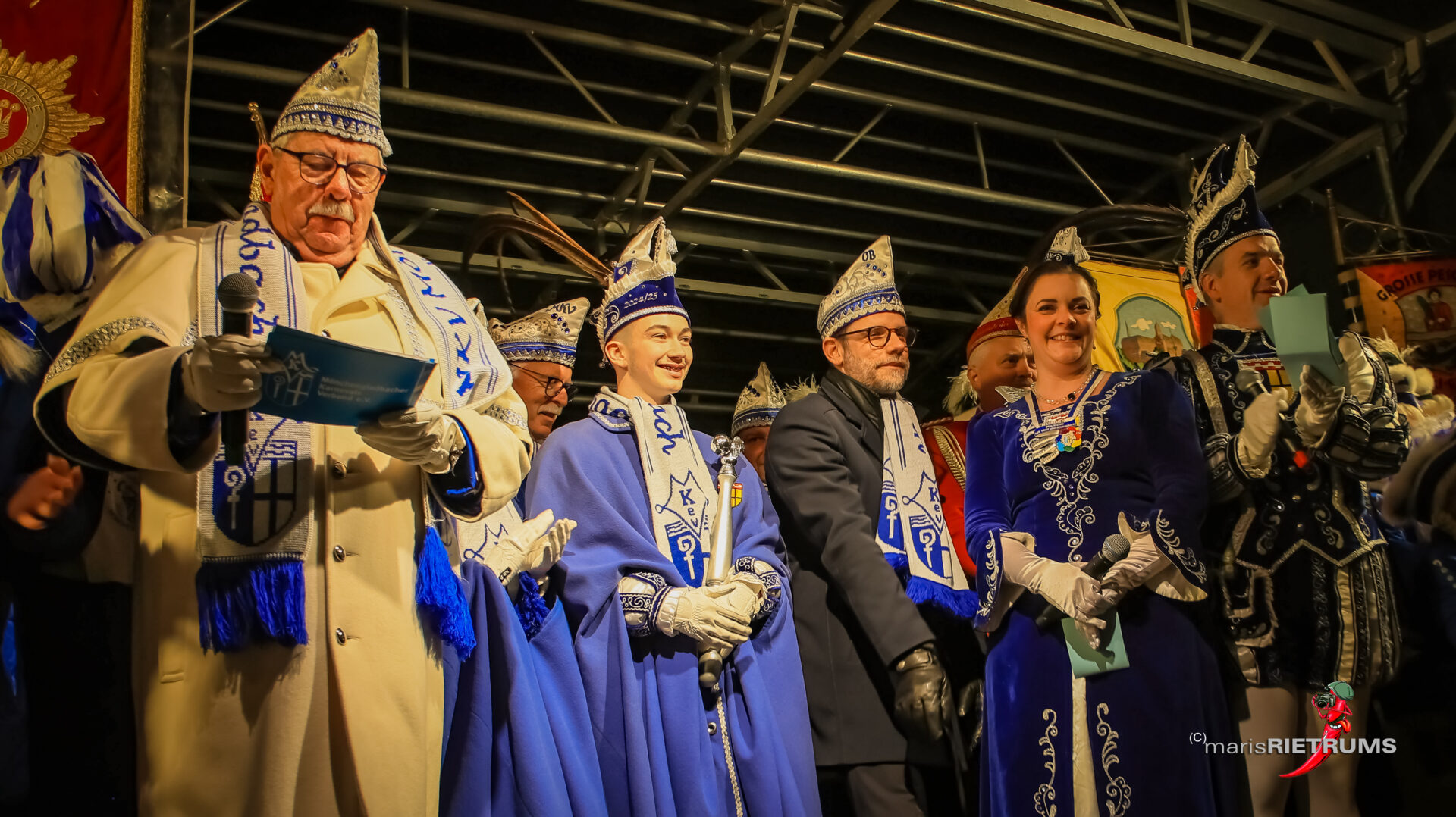 Während die Besucher dicht gedrängt das Vorprogramm mit der MKV-Showband und Sängerin Jenny verfolgten, sammelten sich im Alten Zeughaus die amtierenden Prinzenpaare für ihren letzten großen Auftritt der Session. Pünktlich um 18.11 Uhr setzte sich der Zug der Tollitäten, begleitet von Garden, Präsidium und Prinzenclub, in Richtung Innenstadt in Bewegung. Der Einzug markierte den Beginn eines besonders emotionalen Abschnitts des Abends. Die jungen Kinderregenten Melissa I. und Nicklas I. sowie das große Prinzenpaar Alexander I. und Niersia Kathrin blickten ein letztes Mal auf ihre Monate im Amt zurück, die für sie mit zahlreichen Auftritten, Begegnungen und Herausforderungen verbunden waren. Für beide Paare war der Abschied offensichtlich schwer, denn die letzten gemeinsamen Minuten auf der Bühne waren geprägt von großer Wehmut und Dankbarkeit.