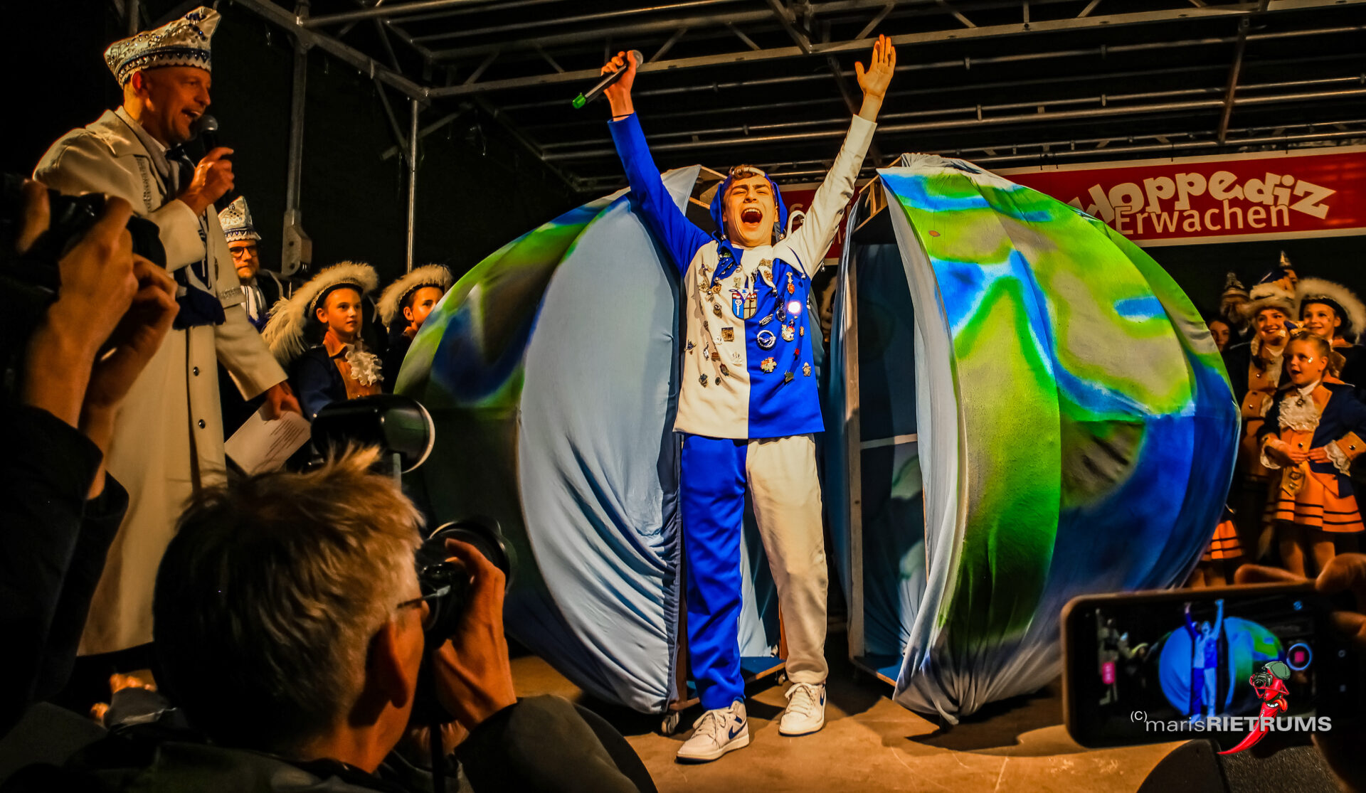 Nach dem Abschied der bisherigen Tollitäten rückte auf der Bühne die große Weltkugel in den Mittelpunkt – das zentrale Element des diesjährigen von Nik Ebert gestalteten Mottos „Gladbach ist als jecke Welt … allerbestens aufgestellt“. Mit lautstarken Rufen der Jecken wurde schließlich der Hoppediz geweckt, der aus der Kugel hervortrat und mit seinem energiegeladenen Auftritt die Menge endgültig in Feierlaune versetzte. Damit war klar: Die neue Session hat begonnen. Bis Aschermittwoch am 18. Februar erwartet die Stadt ein dicht gefüllter Kalender mit Veranstaltungen rund um Altweiber, Tulpensonntag, Rosenmontag und den großen Veilchendienstagszug – in diesem Jahr aufgrund der Kalenderlage zwei Wochen kürzer als die vorherige Session, aber keineswegs weniger intensiv. (cs)