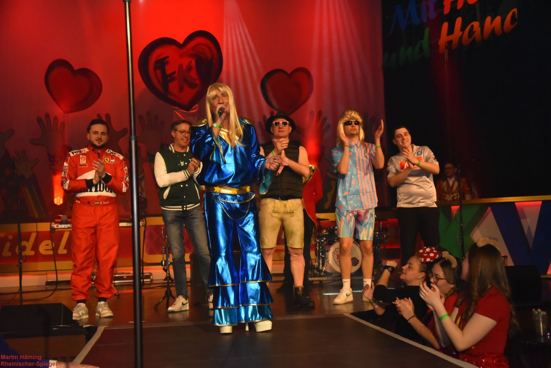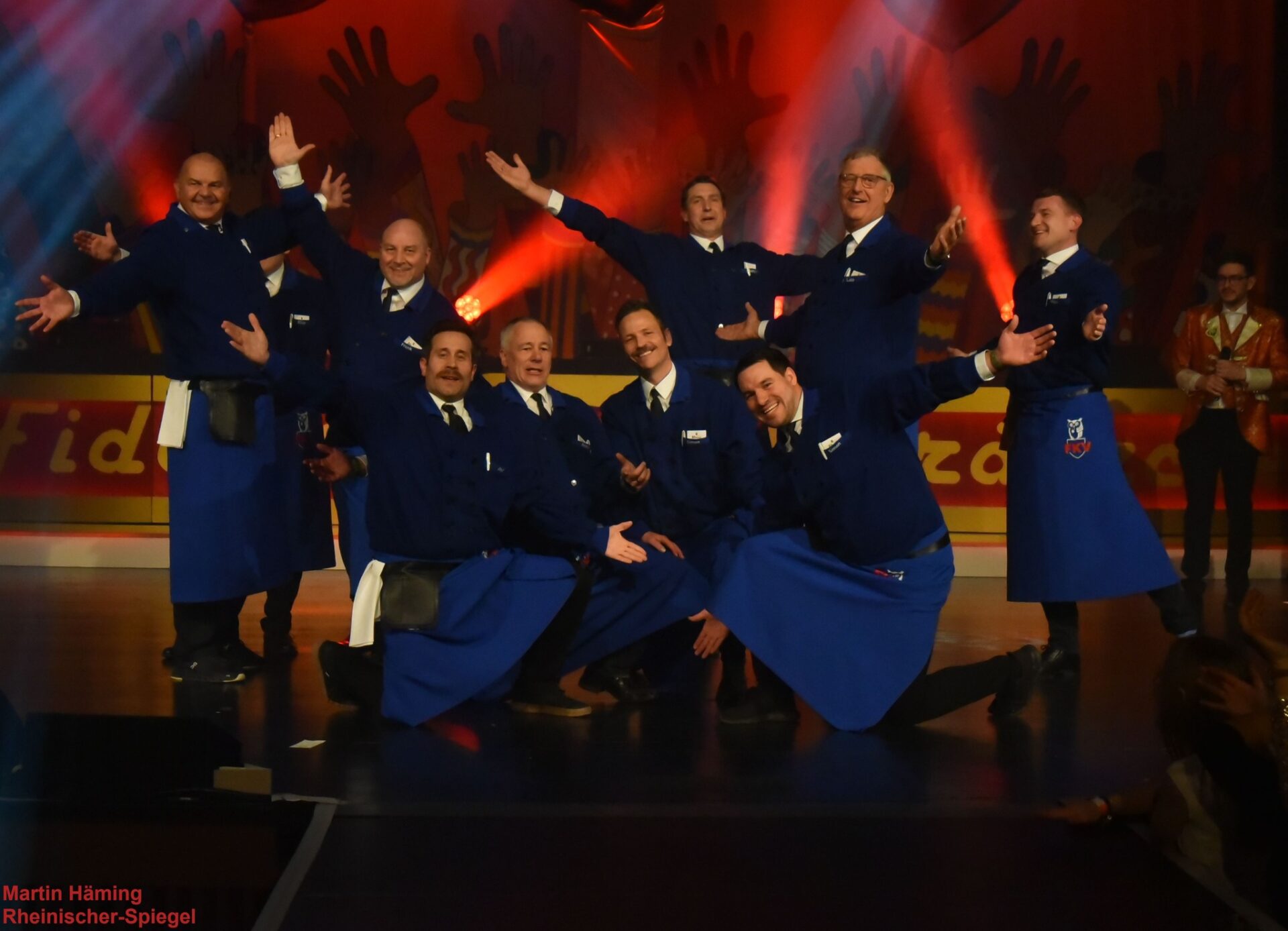 Die FKV-Sänger taten ebenfalls, was Sänger am besten können: sie rissen die Herzen mit Melodien hin und her. Stimmen, mal rauchig, mal samtig, erzählten von Heimat, Liebe und karnevalistischer Lebenslust. Das „Bickendorfer Büdche“ fand ebenso Platz wie „Hulapalu“. Ihre Lieder trafen den Saal wie Goldregen; Textzeilen wurden spontan mitgesungen, Harmonien ließen Nackenhaare aufstehen, noch ehe die zweite Strophe ansetzte. Zwischen schunkelnden Refrains und leisen Passagen entstanden kleine, intime Momente mitten im Trubel — Augenpaare trafen sich, Hände fanden sich. Neugierig? Zu wenig Details? Verständlich … aber zu viel spoilern ist hier an dieser Stelle nicht, denn am heutigen Abend wird die vereinseigene Show bei der FKV-Galasitzung noch einmal für Jubel sorgen, der hier nicht vorweggenommen werden soll.