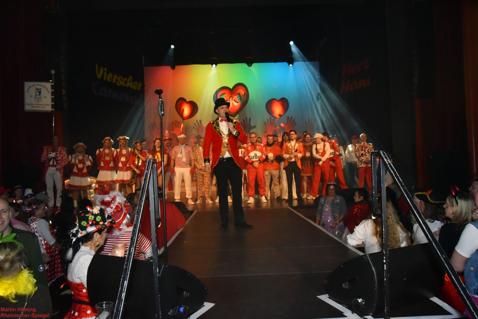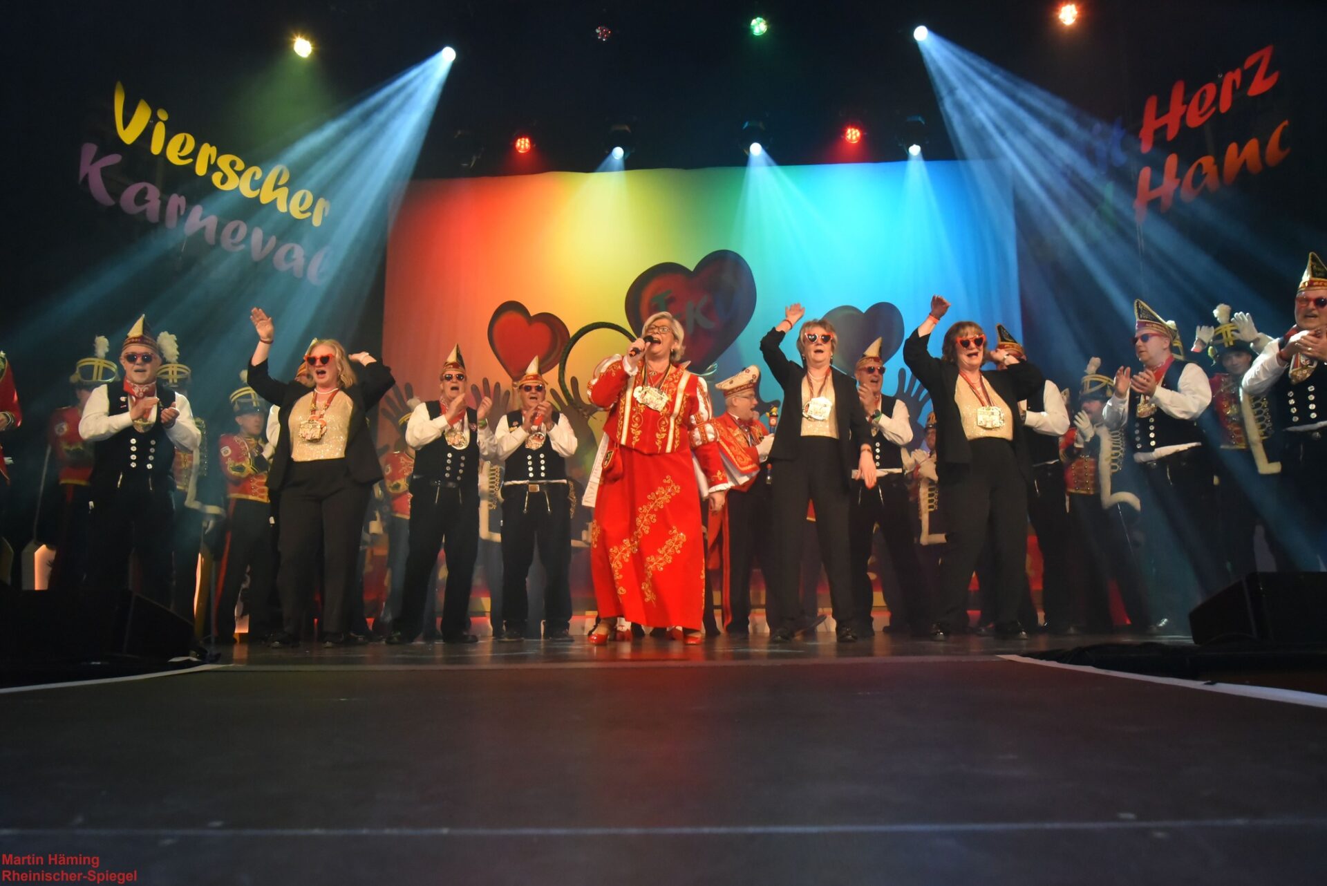 Das Bühnenbild an diesem Abend war mehr als Kulisse; es war Partner der Akteure: aufwändige Requisiten, thematisch getrimmte Lichter, bunte, riesige Hände. Alles atmete das Sessionsmotto „Vierscher Karneval mit Herz und Hand“ — sichtbar an kleinen Gesten, am Einsatz der Ehrenamtlichen, an der Liebe zum Detail in jeder Kostümnaht.