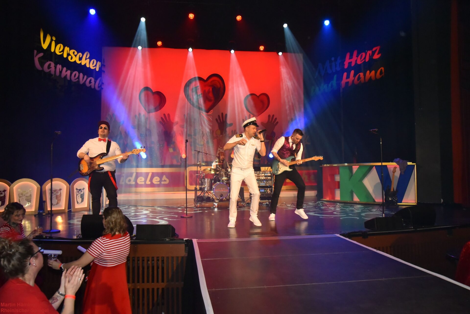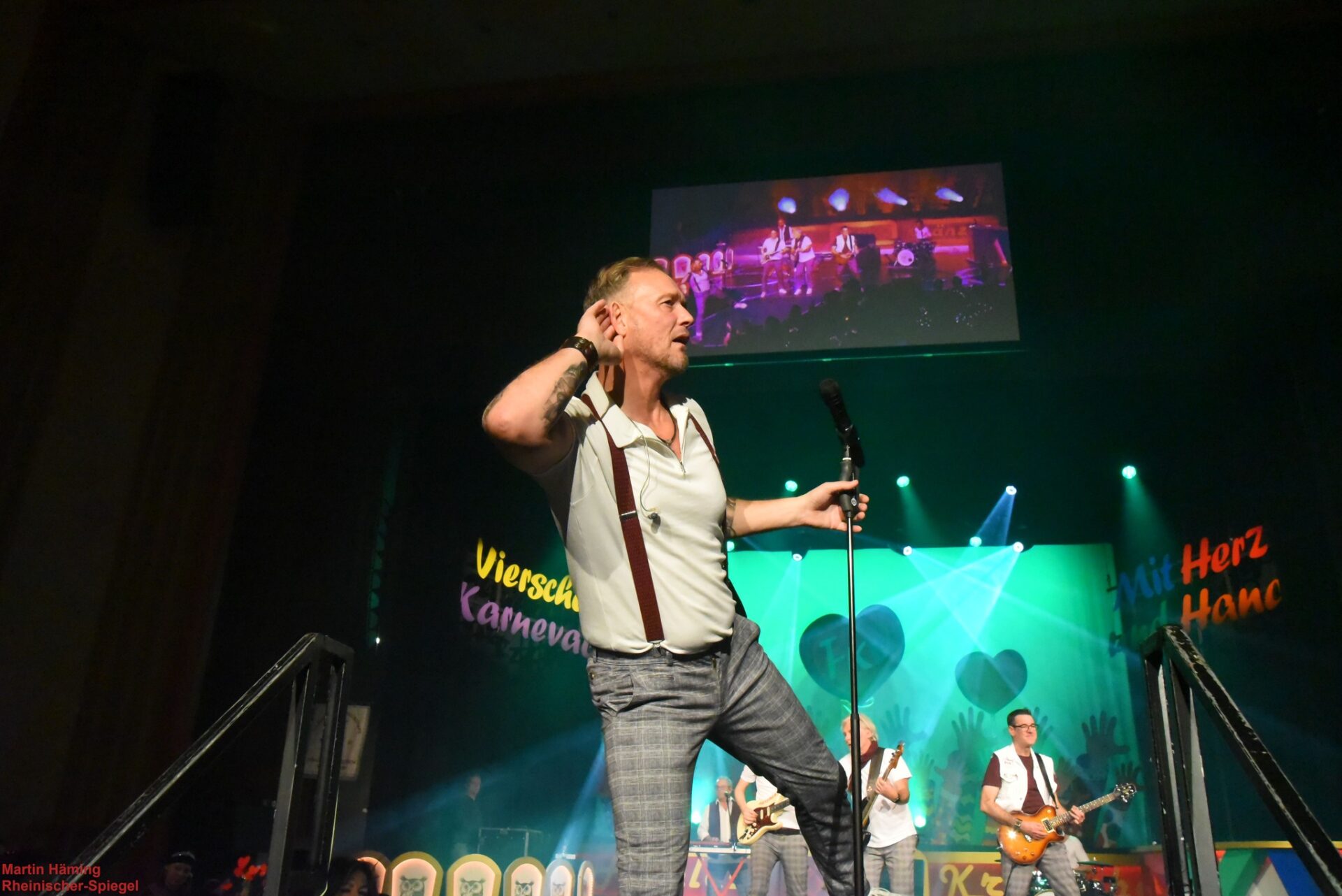 Und dann: Hätzblatt. Die Band, die seit 1995 Bühnen im Karneval bespielt, schuf eine Atmosphäre, die zwischen Tränen und Trallala pendelte. Reiner Jennißen setzte seine Gesangslinien – ebenso wie seine Trompete – ein wie Salz in einer kräftigen Suppe, sie schwebten über den Gitarren von Marco Winkler und Ingo Cremers. David Venrath am Schlagzeug trieb die Stücke mit trockenem Puls, Uwe van Helden am Bass und Christopher Viehausen am Keyboard füllten den Raum mit einer Soundwand, die sowohl Mitschunkler als auch Gänsehautbesucher bediente. „Bliev bei mir“ wurde zum emotionalen Kompass, „All dat es Heimat“ zur kollektiven Umarmung; „Knuutsch e!“, „De Mamm“ und „Seemann“ reichten vom Träller-Hit zum Mitgröhlmoment — mal sentimental, mal ausgelassen, stets schnörkellos echt. Hätzblatt ließ keine Stilrichtung aus, aber immer mit Herz: die Reihen auf dem Parkett wurden zu Wellen, die sich gegenseitig hochtrugen.