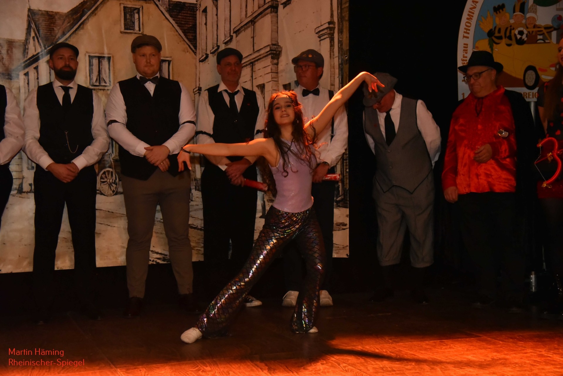 Für einen Überraschungsmoment sorgte die Süchtelner Prinzengarde. Statt im gewohnten Uniformen-Look betraten sie die Bühne in einem völlig anderen Outfit – so ungewohnt, dass mancher im Saal zweimal hinschauen musste. „Wir hätten euch ja fast nicht erkannt!“, witzelte ein Jeck vor der Bühne. Doch was blieb, war die sportliche Klasse: Gemeinsam mit ihrem Mariechen zeigten sie akrobatische Sprünge und kraftvolle Elemente, bei denen der Atem im Saal spürbar anhielt. Spätestens nach der letzten Drehung hielt es niemanden mehr auf den Plätzen.