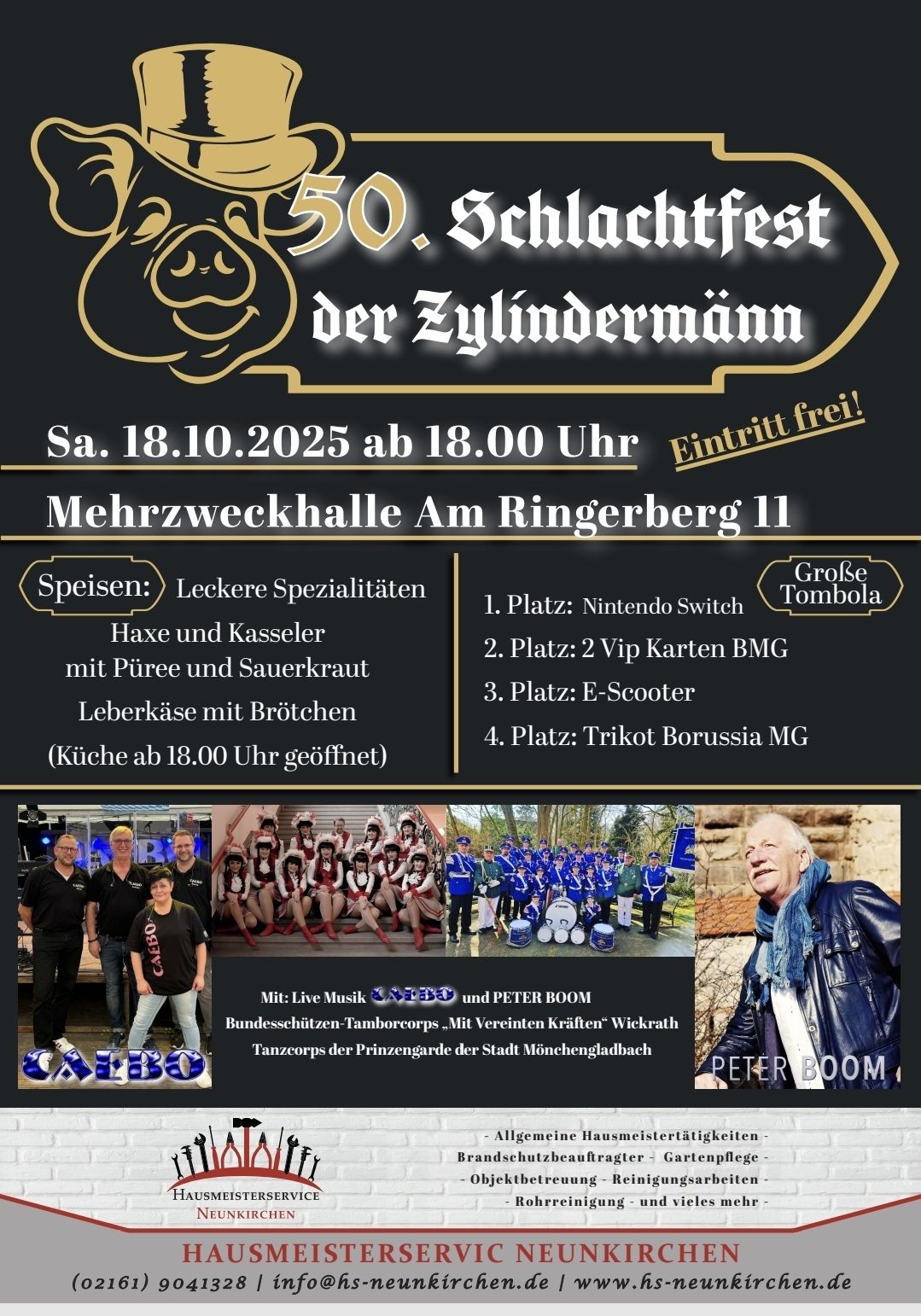 Passend zum 50jährigen Jubiläum des Schlachtfestes haben die Zylindermänn ein attraktives musikalisches Programm zusammengestellt: Für Live-Musik sorgen die Partyband CAEBO und Peter Boom, seines Zeichens Ehrenmitglied der Zylindermänn. Auch das Bundesschützen-Tambourcorps „Mit Vereinten Kräften Wickrath“ wird in Waldhausen spielen. Mit dem Auftritt des Tanzcorps der Prinzengarde der Stadt Mönchengladbach kündigt sich ein weiterer Höhepunkt an. Daneben gibt es die Große Tombola der Zylindermänn mit Preisen wie VIP-Karten oder einem Trikot unserer Borussia, einer Nintendo Switch oder einem E-Scooter. Es gibt wahrlich gute Gründe, nach Waldhausen zu kommen und sich das Jubiläum des Schlachtfestes nicht entgehen zu lassen.