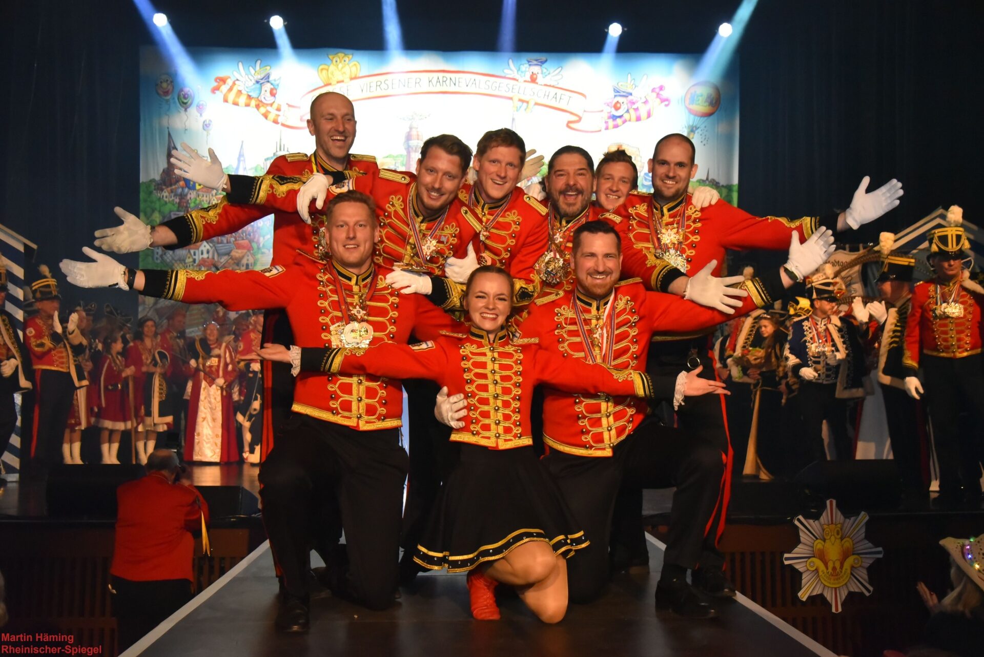 Viersche – Als die schweren, hölzernen Türen der altehrwürdigen Viersener Festhalle am gestrigen Morgen aufgingen, ergoss sich ein bunter Strom aus Uniformen, Orden, Federbüschen und leuchtenden Perücken auf die Parkettfläche; hier ein Schärpenmeer in Rot und Gold, dort ein Meer von tiefblauem Tuch — die Farben der GVK mischten sich mit den Kostümen der Gäste aus Düsseldorf, Köln und dem ganzen Niederrhein. Über allem stand das Sessionsmotto wie ein Versprechen: „Jekumme öm te bliiwe“ — gekommen, um zu bleiben — und der Schlachtruf „Viersche öss joot!“ hallte schon bei Einzug durch die Halle mit dem Viersener Tambour Corps 1925 e. V., welches zu diesem Anlass ebenfalls in Blau angetreten war.