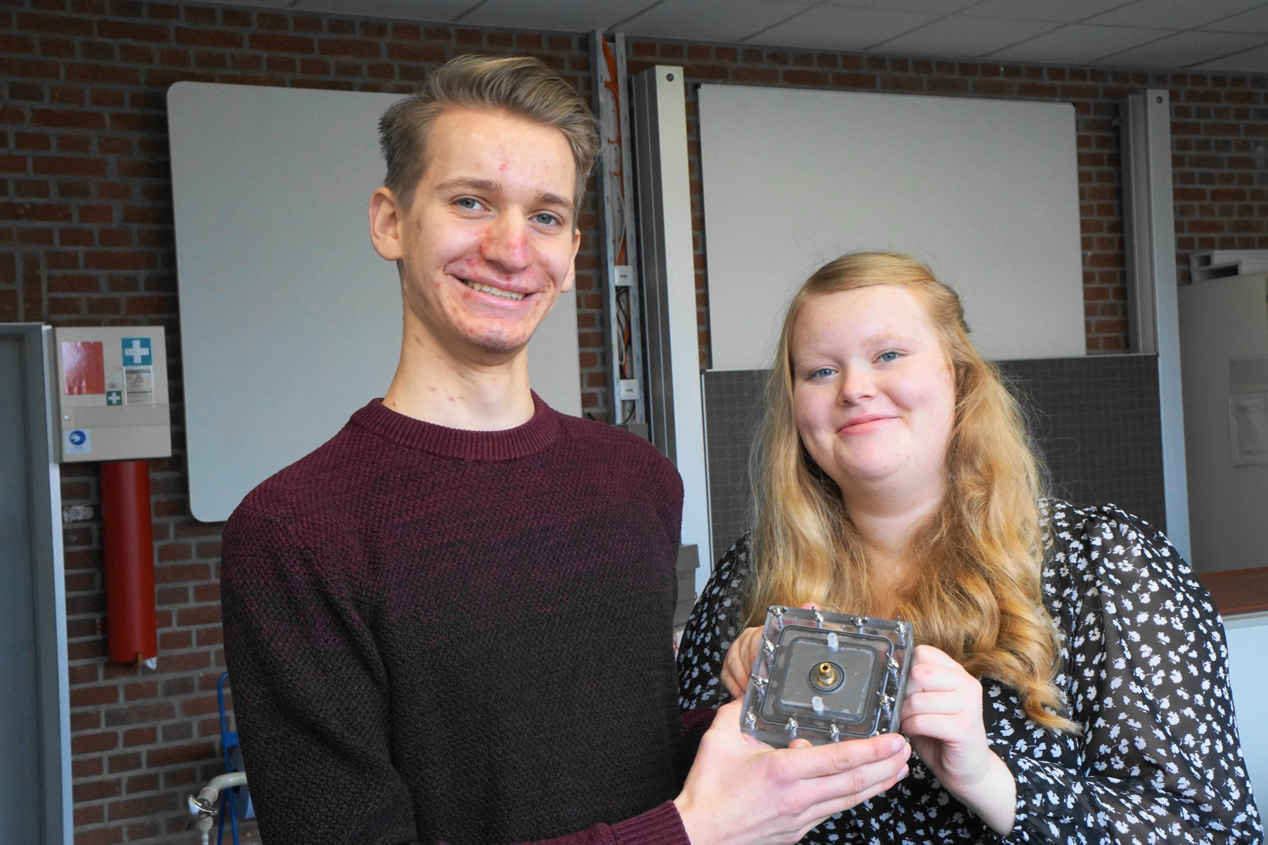 Annalea Swigon (19) und Simon Rehberg (18) von der Gesamtschule Brüggen mit ihrer Redox-Flow Batterie. Foto: Unternehmerschaft Niederrhein