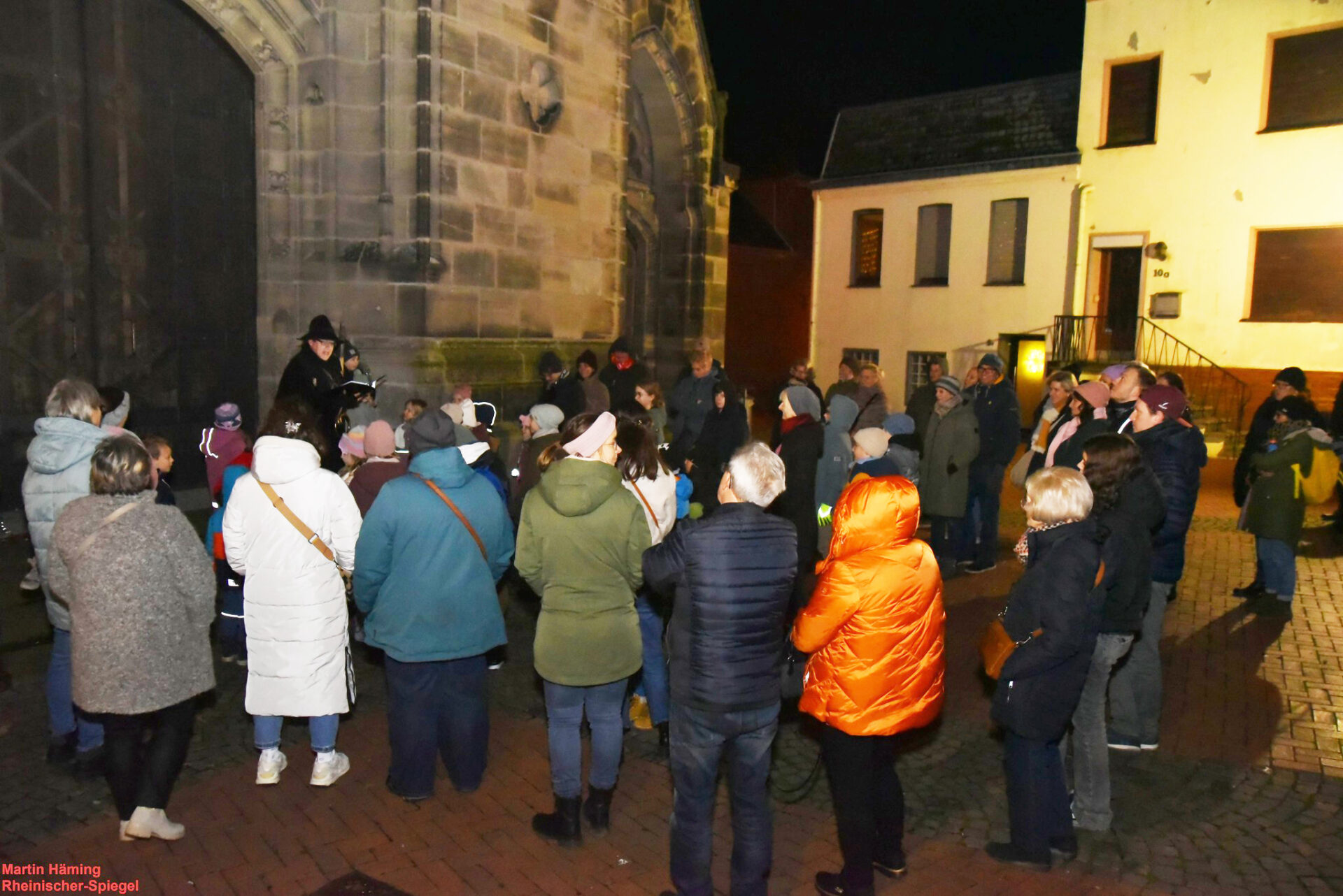 Viersen-Dülken – Am späten Donnerstagnachmittag, als sich die Dunkelheit bereits über die Innenstadt legte, begann im Schatten des Dölker Doms eine ganz besondere Nachtwächterrunde. Innerhalb weniger Minuten hatte sich der kleine Platz in eine erwartungsvolle Bühne verwandelt, auf der rund 40 Kinder und etwa 50 Erwachsene dicht zusammengerückt standen – als würde die Altstadt selbst den Atem anhalten. Sie alle warteten auf den Dülkener Nachtwächter André Schmitz, der in diesen besonderen Spaziergang auch einen ganz besonderen Gast eingebaut hatte.
