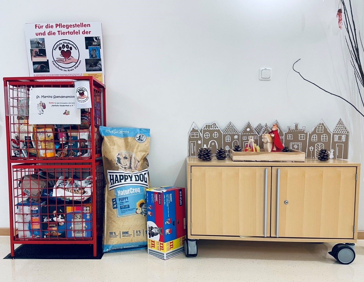 Sankt Martin ist alljährlich das Fest vom Teilen und Helfen. Höhepunkt jedes Martinszuges ist die Szene des Mantelteilens. Die Kindertagesstätte wollte die symbolische Darstellung mit Leben füllen und den Kindern bewusst näherbringen. Weil in diesem Kindergartenjahr das Jahresthema: „Natur-Tiere-Wald und Garten“ lautet, wurde entschieden, den gemeinnützigen Verein „Notfelle Niederrhein“ mit Tierfutterspenden zu unterstützen.