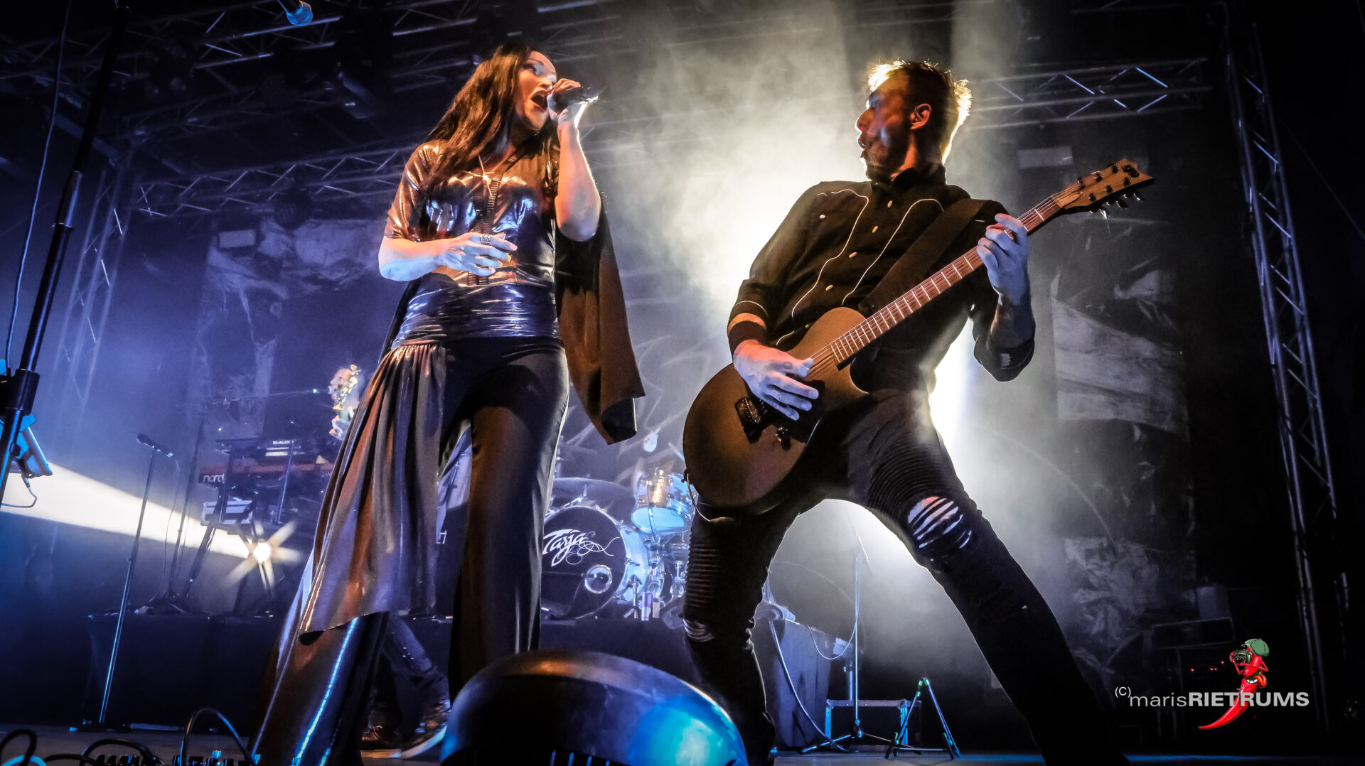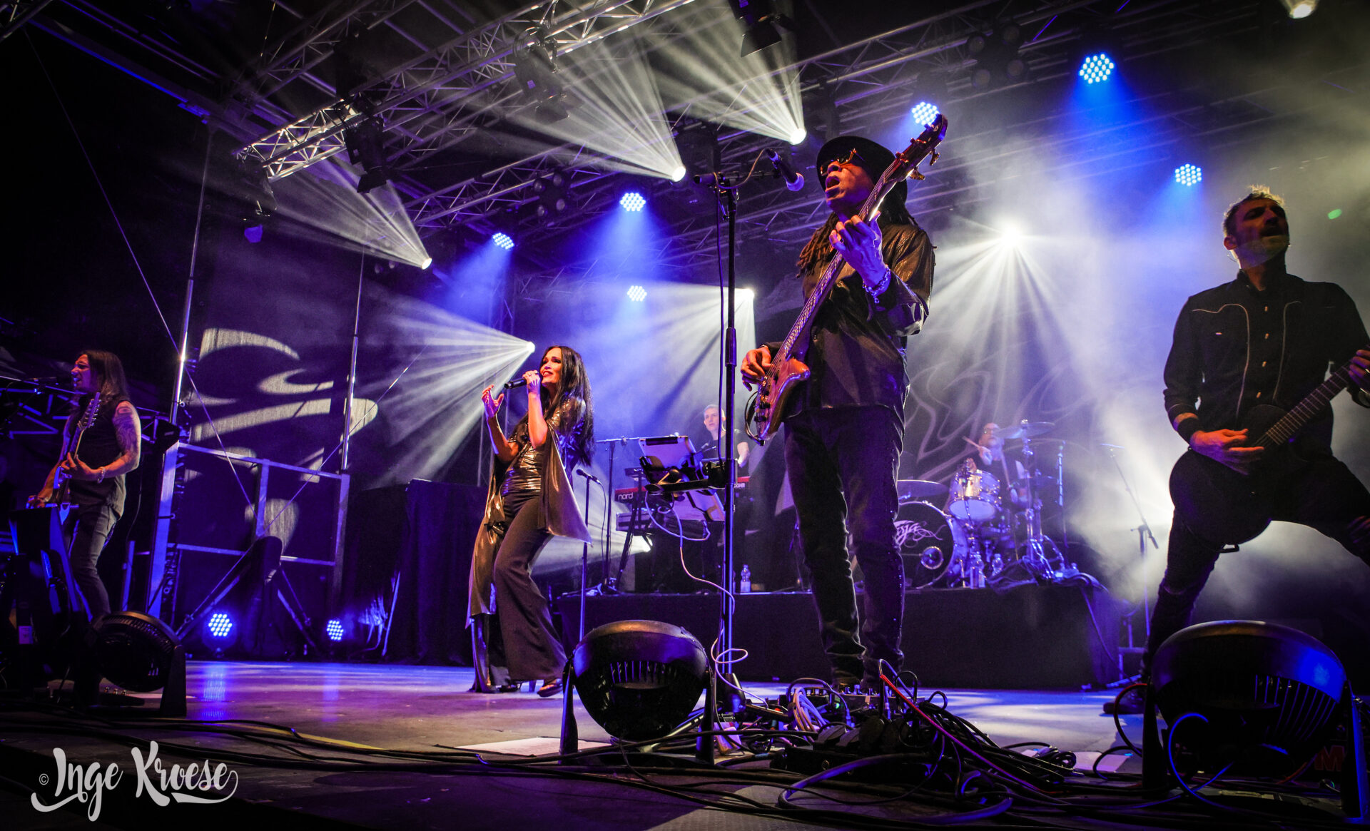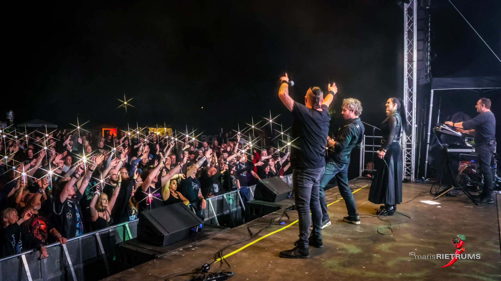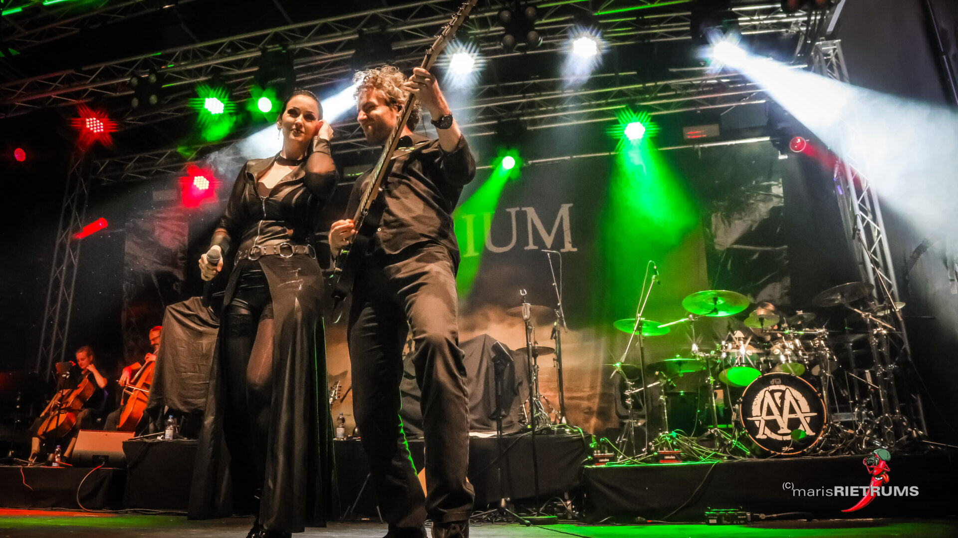 Danach gehörte Aeverium die Bühne, die eigens für diesen Abend eine ganz besondere Ensemble-Show einstudiert hatten. Mit der Doppelspitze aus der charismatischen Stimme von Marcel „Chubby“ Römer und der glasklaren Power von Vanessa Katakalos verschmolzen harte Riffs mit orchestraler Tiefe. Celli von David Koebele und Carina Praschma verliehen den Songs eine fast sinfonische Gravität, während Gitarrist Maarten Jung, Keyboarder Andreas Delvos und Drummer Bodo Stricker die Bühne in eine brodelnde Klangwelt verwandelten. Zwischen Wucht und Melodie nahm das Publikum eine Reise mit, die weit über ein klassisches Rockkonzert hinausging – emotional, intensiv, einzigartig.