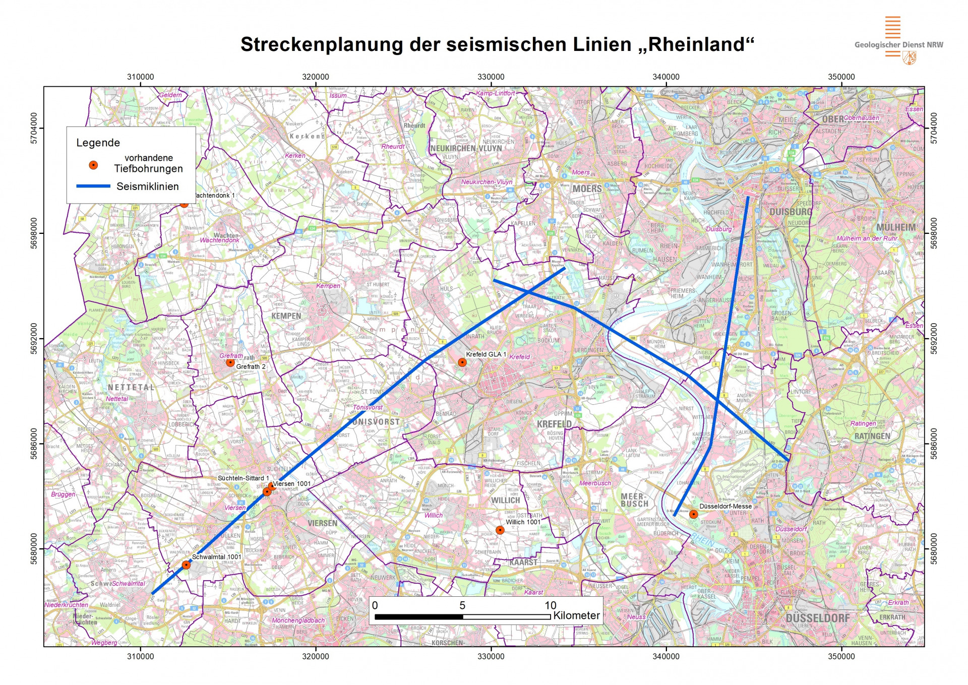 Die Messungen beginnen am 8. Oktober in der Gemeinde Schwalmtal, verlaufen über eine 35 km lange Strecke durch die Städte Viersen und Tönisvorst und enden in Krefeld (Grafik). Für diese Messungen bewegt sich ein Konvoi aus drei Vibrationsfahrzeugen einen Monat lang in langsamen Tempo entlang der geplanten Route. In festen Abständen werden über kleinere Vibrationen Schallwellen ausgesendet (emittiert), welche an den Grenzen verschiedener Gesteinsarten reflektiert und anschließend über Geophone erkannt (detektiert) werden. Hierbei handelt es sich um eine schonende Untersuchungsmethode, die ohne Bohrungen und Eingriffe in den Boden stattfindet.