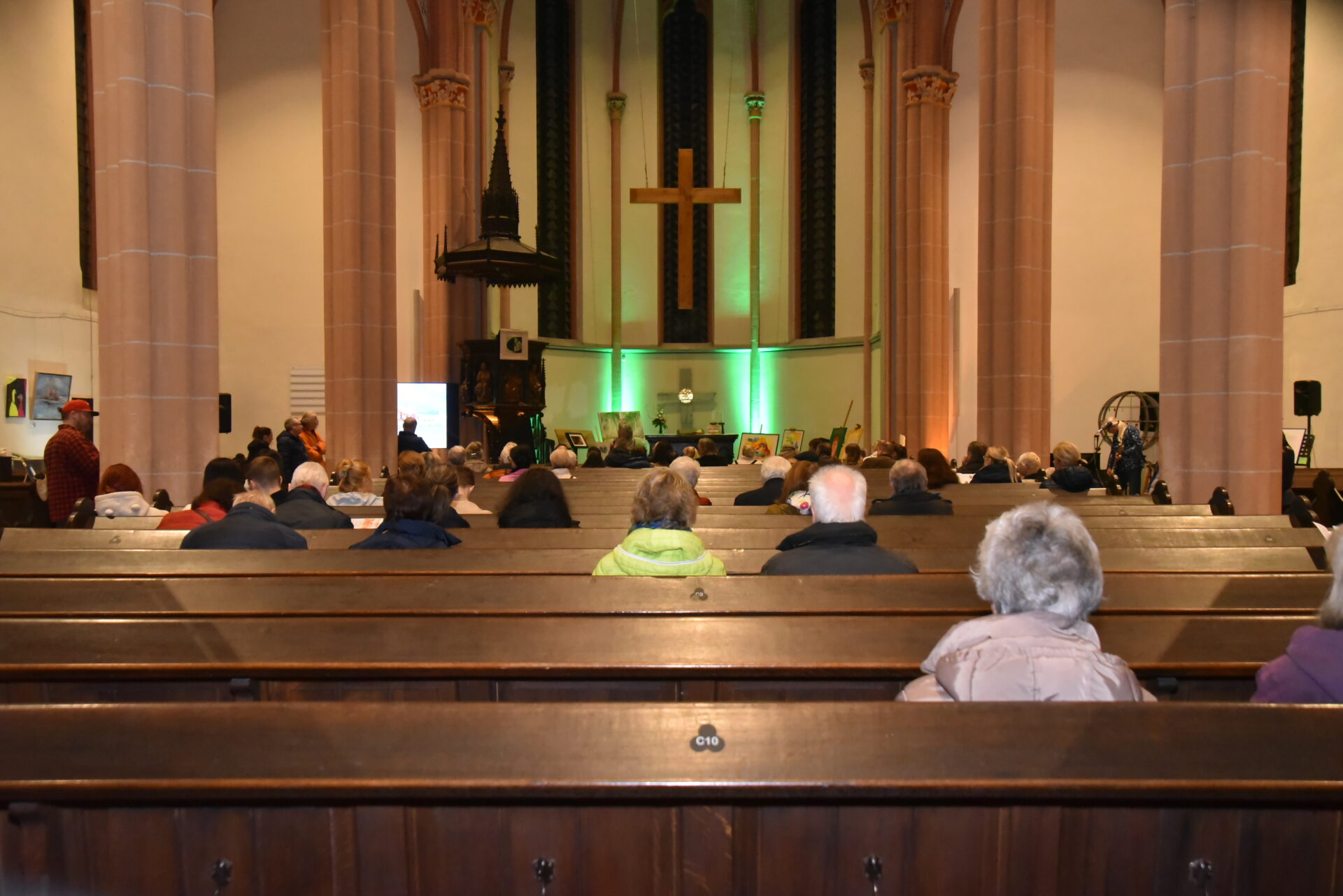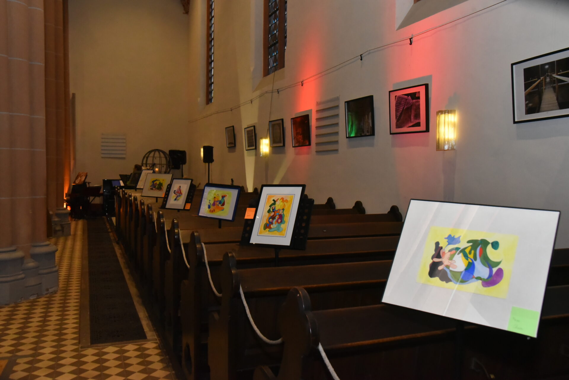Die besondere Intensität des Abends speiste sich aus der Nähe. Besucher saßen nicht distanziert, sondern mitten im Geschehen. Blicke wanderten zwischen Kunstwerken, Musikern und Sprechenden hin und her. Gespräche entwickelten sich spontan, Gedanken wurden geteilt, Eindrücke abgeglichen. Die Kreuzkirche wurde so zum Darstellungsraum, in dem Zuhören, Betrachten und Mitdenken gleichermaßen gefordert waren. Ein wunderbarer Impuls – selbst für „Kunstmuffel“ – die in der Kreuzkirche frisch an die Fantasiewelten anderer herangeführt wurden.