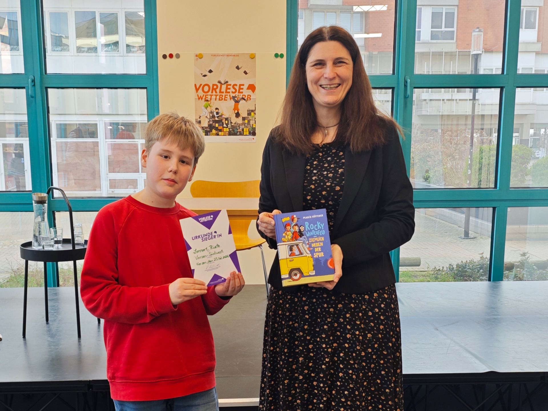 Alle teilnehmenden Kinder erhielten eine Urkunde sowie das Buch „Rocky Winterfeld“ von Marie Hüttner. Die beiden Erstplatzierten haben sich für die nächste Stufe des Wettbewerbs, den Bezirksentscheid Düsseldorf-Nord, qualifiziert. Dieser wird im März oder April in Oberhausen in den Räumen von Karl Maria Laufen Buchhandlung und Verlag stattfinden. Der Termin wird noch bekanntgegeben.