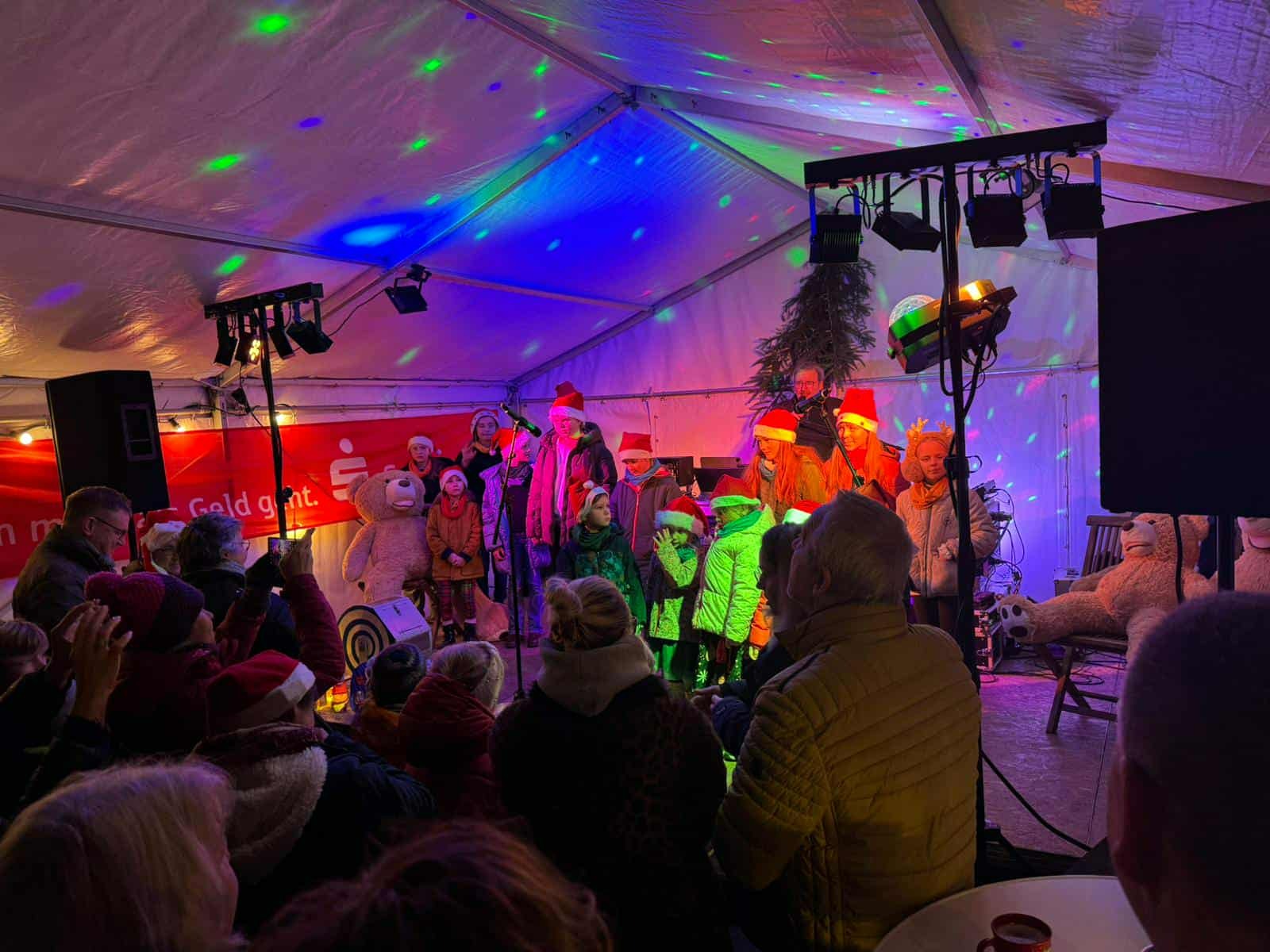 Besonders die Kinder hatten ihre Freude: Mit selbstgebastelten Laternen und Lichtern kamen sie zur Bühne, um sich die Chance auf einen der drei großen Teddybären zu sichern, die an diesem Abend verlost wurden. Die Aufregung war spürbar, als die Flummis ihren eigens komponierten Song „Lichterglanz wie tausend Sterne“ präsentierten und damit den Countdown zum Einschalten der Weihnachtsbeleuchtung musikalisch begleiteten. In diesem Jahr funktionierte alles wie geplant: Pünktlich nach dem Countdown erstrahlten die Lichter auf dem Kreuzherrenplatz … gut die Beleuchtung der Rotbuche hatte ein wenig verschlafen.