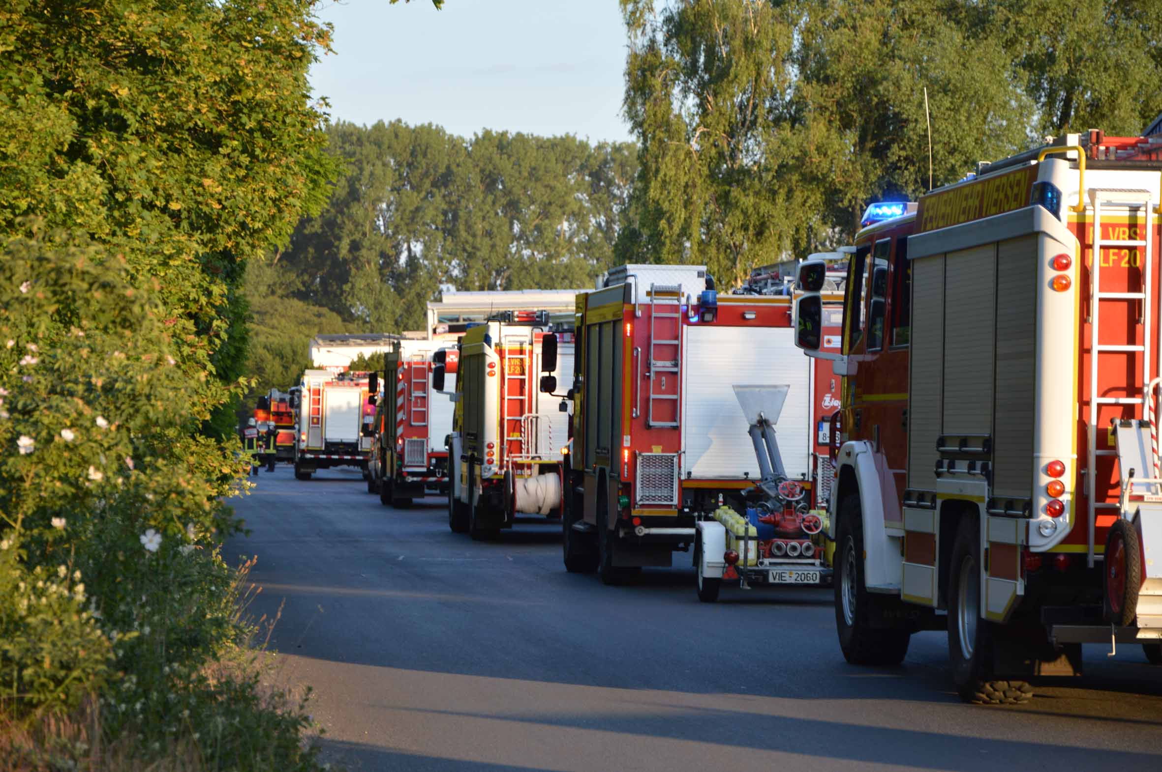 Zwischen 19:30 und 22 Uhr fahren Großfahrzeuge der Feuerwehr Viersen durch den Wald. Die Wehr verlegt Schläuche, die auf Wegen verlaufen können. In Richtung zur Autobahn A61 wird das Unterholz am Waldrand befeuchtet.