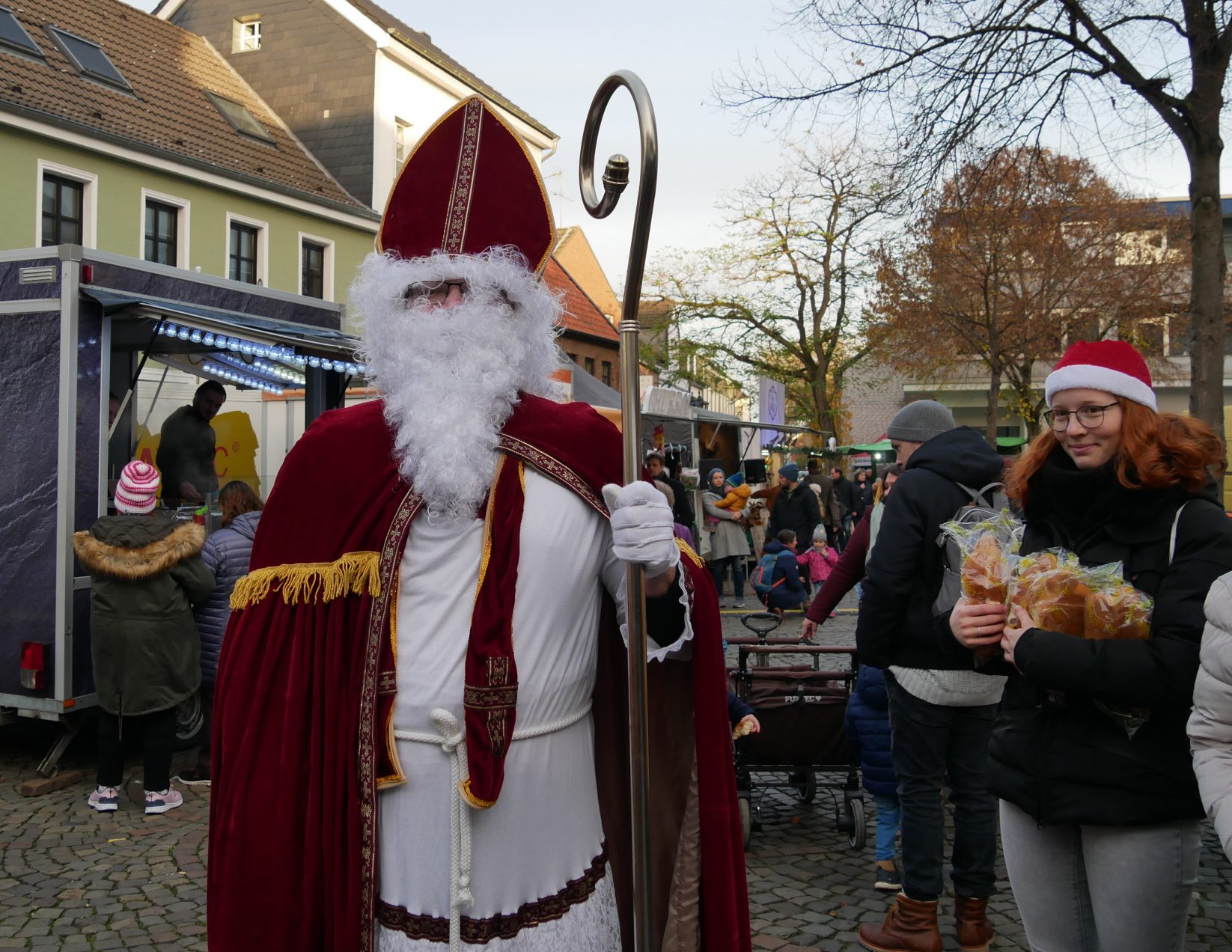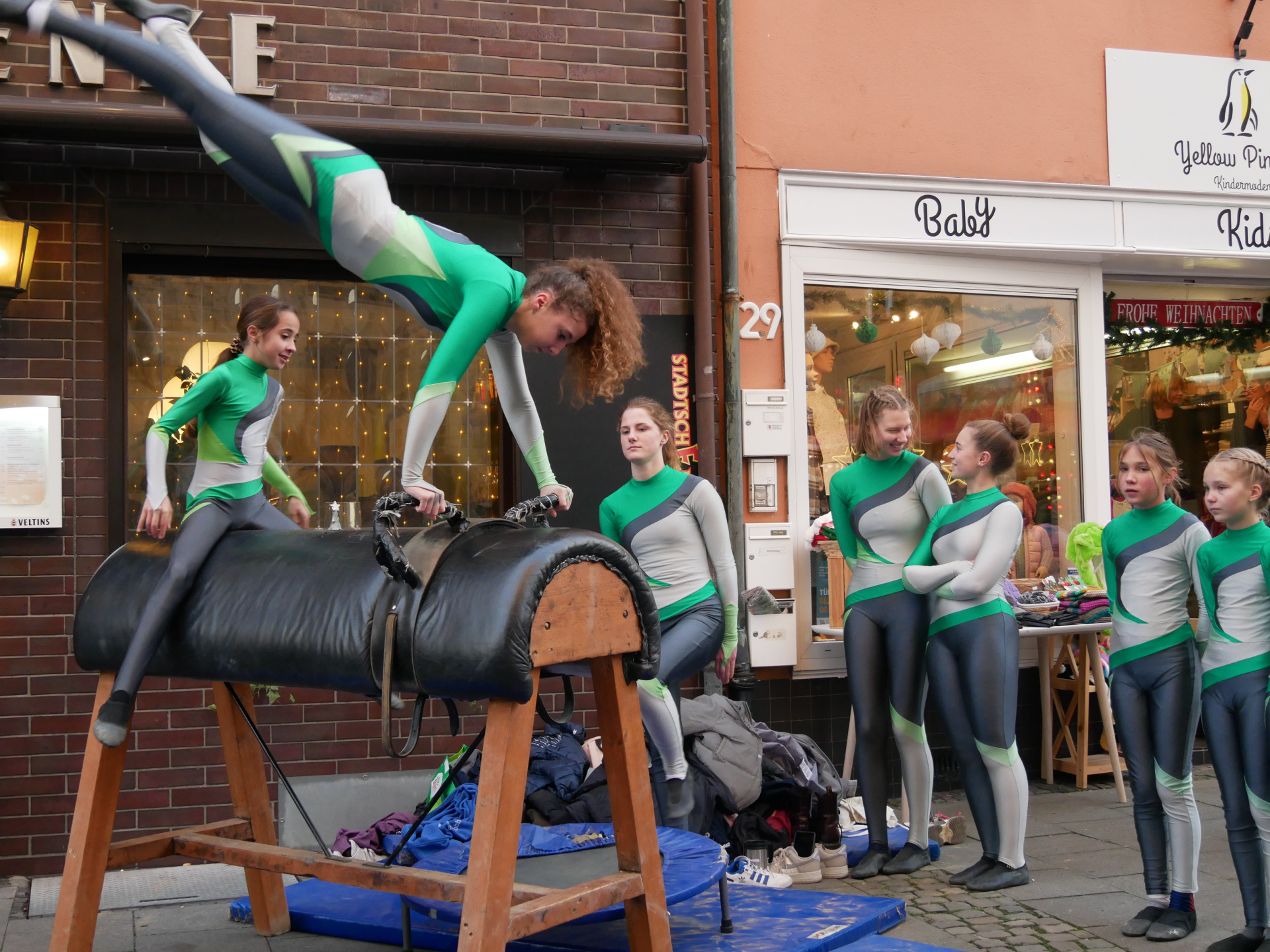 Mit dem Einbruch der frühen Dunkelheit leuchtete die Innenstadt in einem adventlichen Glanz, durch die das vertraute Rufen des Nikolaus zu hören war, der mit leckeren Weckmännern ein glückliches Leuchten in das Gesicht der kleinen Besucher zauberte. Durch die Wipfel der Tannenbäume wehte Musik begleitet von einem stimmgewaltigen Posaunenchor „Wegrather Quintett“ auf dem Lindenplatz oder aus dem Vorlesezelt, in welches das Metropol Theater „Cinderella“ eingeladen hatte, bis hin zu sportlichen Darbietungen.