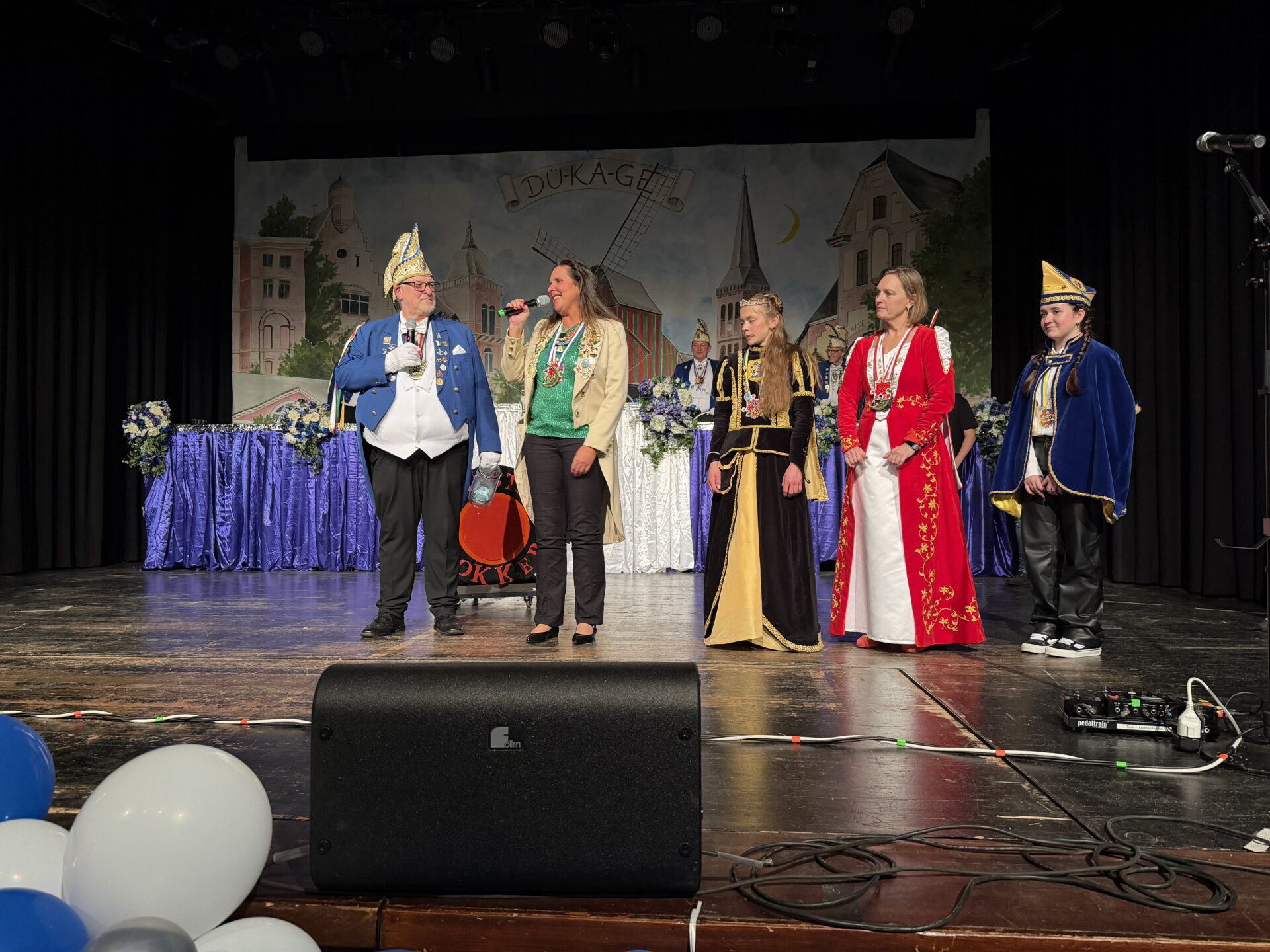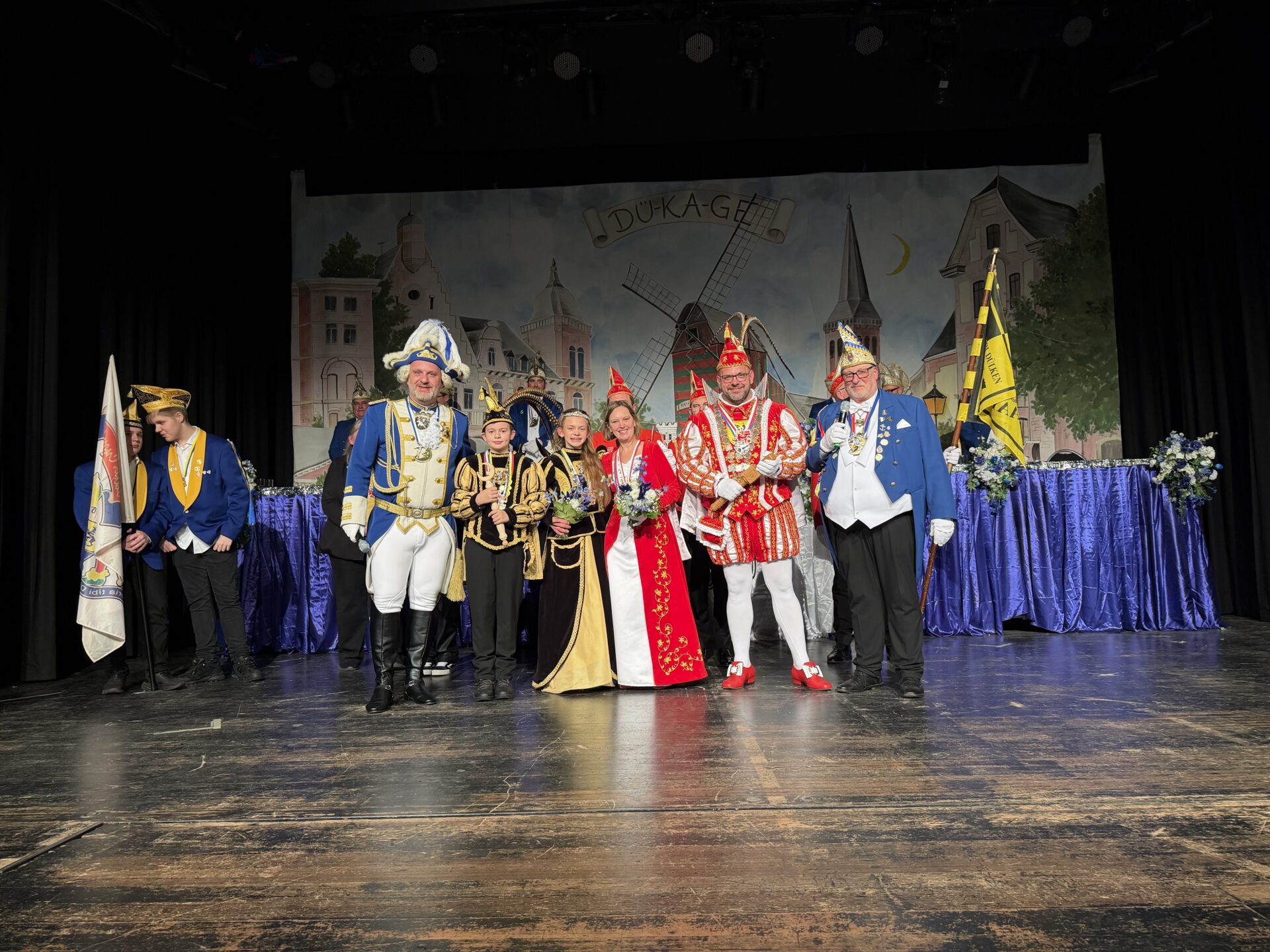 An die Dü-Ka-Ge mit ihrer wunderbaren Funkengarde schloss sich der Einmarsch des Prinzenpaares Ralf I. und Sandra I. sowie des Kinderprinzenpaares Nico I. und Marie I. an. Prinz Ralf I. ließ es sich dabei nicht nehmen das Mikrofon zu ergreifen und das Prinzenlied der laufenden Session stimmgewaltig zum Besten zu geben. Die Menge sang und lachte im Takt, die Stimmung war elektrisierend.