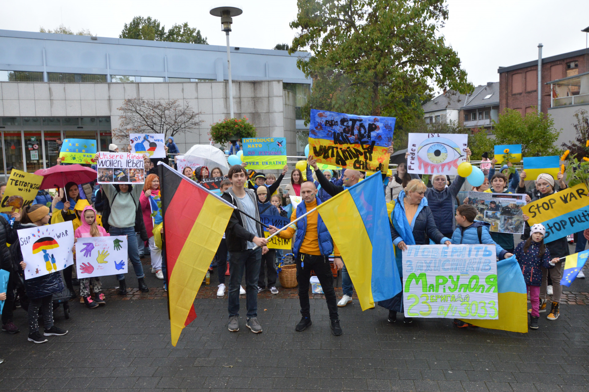 Ungewohnte Klänge in Viersen, wo seit März 2022 viele ukrainische Flüchtlinge eine vorrübergehende, manchmal auch bleibende Heimat gefunden haben. Rund 130 von ihnen gaben am vergangenen Freitag auf dem Sparkassenvorplatz, gemeinsam mit deutschen Freunden, ihren Sorgen, Ängsten und Nöten in Zeiten eines grausamen Krieges eine laute Stimme. Privat organisiert, unter anderem durch die Anmelderin der Solidaritätsaktion Inna Shpakovska, setzten sie kollektiv ein klares Zeichen für ihre Heimat und gegen den Krieg.