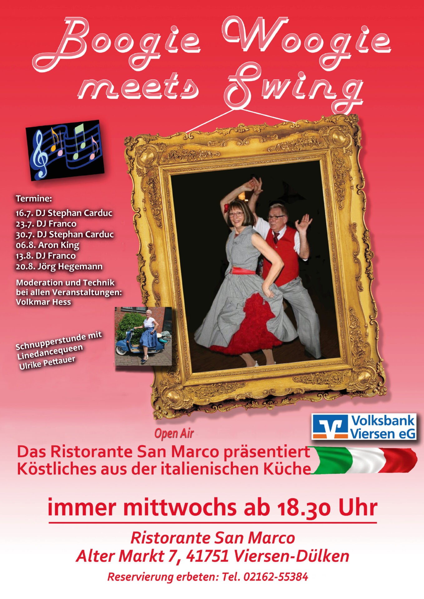 Das Ristorante San Marco veranstaltet “Social Dance – Boogie Woogie meets Swing!” mit Unterstützung von Volkmar Hess (Dülkener Haus des nostalgischen Klanges) am Mittwoch, den 6. August 2025, ab 18.30 Uhr.