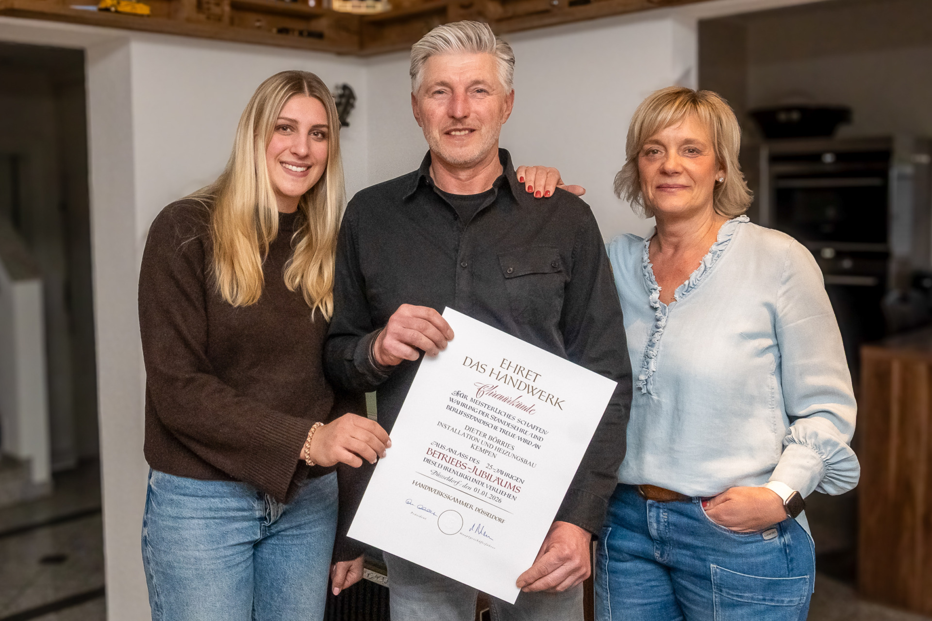 Vor einem Vierteljahrhundert machte sich Dieter Börries in Kempen-St. Hubert mit seinem Meisterbetrieb für Sanitär und Heizung selbstständig. Zum Jubiläum erhielt er die Ehrenurkunde der Handwerkskammer Düsseldorf.