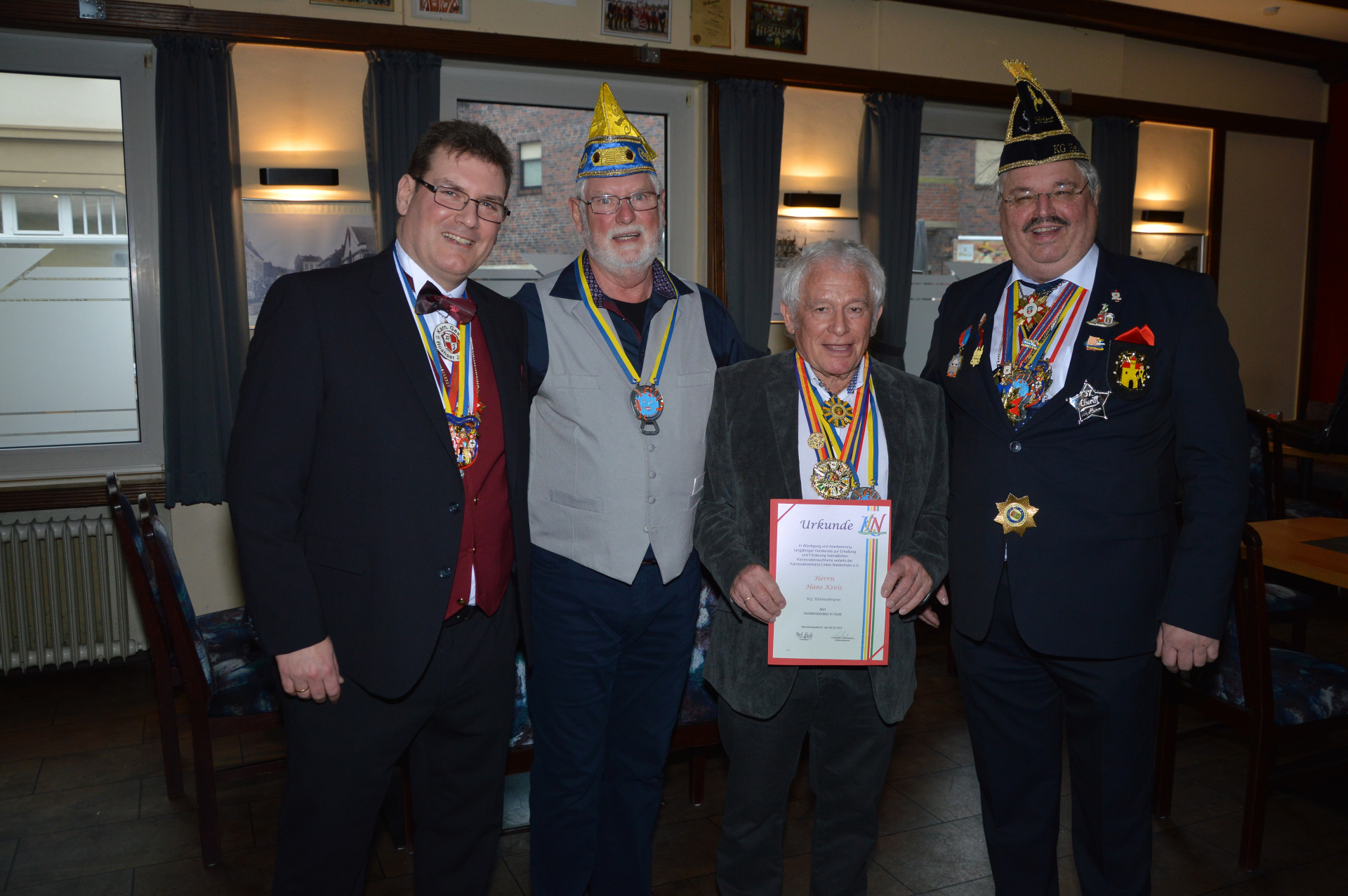 In das Schattodrom am Remigiusplatz hatte die Gesellschaft passenderweise zu ihrem Präsidenten, Helmut Schatten, eingeladen und die Mitglieder folgten gerne dem Ruf nach den Vorgaben der Corona-Maßnahmen. Zu ihnen gesellten sich zudem KLN-Präsident Karl Schäfer und der gerade frisch gekürte Vierscher Prinz Lothar II., denn es galt ein langjähriges, jeckes Mitglied zu ehren. Den 157. Orden in 11 Jahren verlieh der KLN an Hans Kreis – angestoßen werden konnte passenderweise mit einem Stubbi. Nicht nur die kleinen Flaschen können die Mitglieder in dieser Session selber öffnen, vorausgesetzt sie haben den aktuellen Orden dabei.