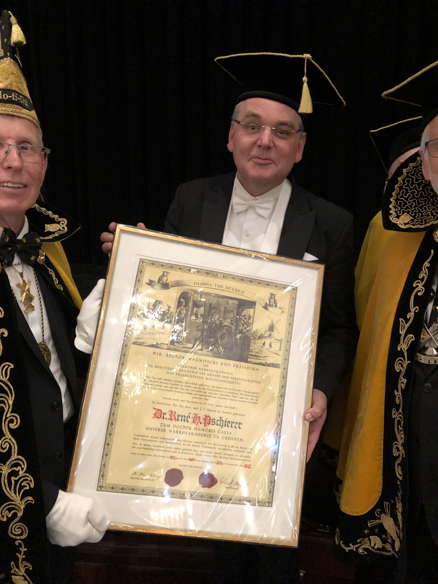 Die berittene Akademie der Künste und Wissenschaften, die erleuchtete Monduniversität promovierte an diesem Wochenende bei ihrem 44. Kreuzherrenessen am 182. Tag des Jahres 469 ihres Bestehens den neuen Doctor humoris causa nach strengem Rigorosum im Dülkener Bürgerhaus.