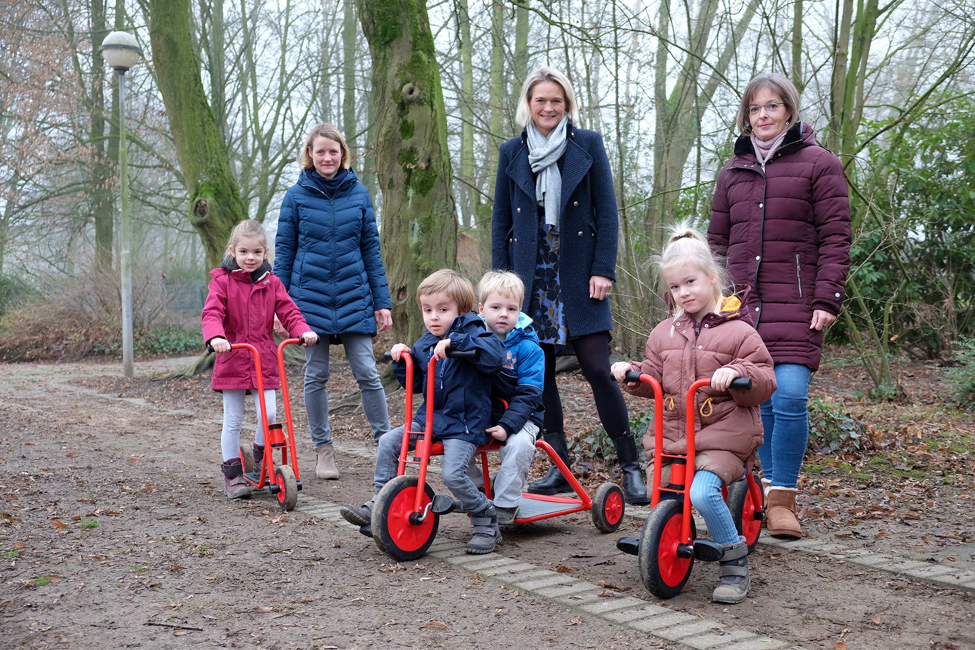 Viersen-Süchteln – Eva Neeten, Vorsitzende des Fördervereins, Andrea Winterberg, Leiterin der Süchtelner Geschäftsstelle der Volksbank Viersen, und Heike Schroeren, stellvertretende Leiterin des Kindergartens Heidweg sowie Victoria, Frederik, Jasper und Marie waren bei der offiziellen Übergabe dabei. Andrea Winterberg: „Bewegung an der frischen Luft tut gut. Ich finde es klasse, dass die Kinder bei fast jedem Wetter draußen sind. Frische Luft pustet das Gehirn durch. Und mit den neuen Fahrzeugen können sich die Kinder richtig austoben und Wettrennen veranstalten.”