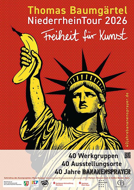 Im Jahr 2026 feiert Thomas Baumgärtel – international bekannt als „Bananensprayer“ – das 40-jährige Jubiläum seiner ikonischen Spraybanane. Aus diesem Anlass initiiert der Künstler eine außergewöhnliche Ausstellungsreihe am Niederrhein: Unter dem Titel „Freiheit für Kunst“ werden in den Monaten Mai, Juni und Juli 2026 insgesamt 40 Kunstorte parallel Werkgruppen aus vier Jahrzehnten seines Schaffens präsentieren.