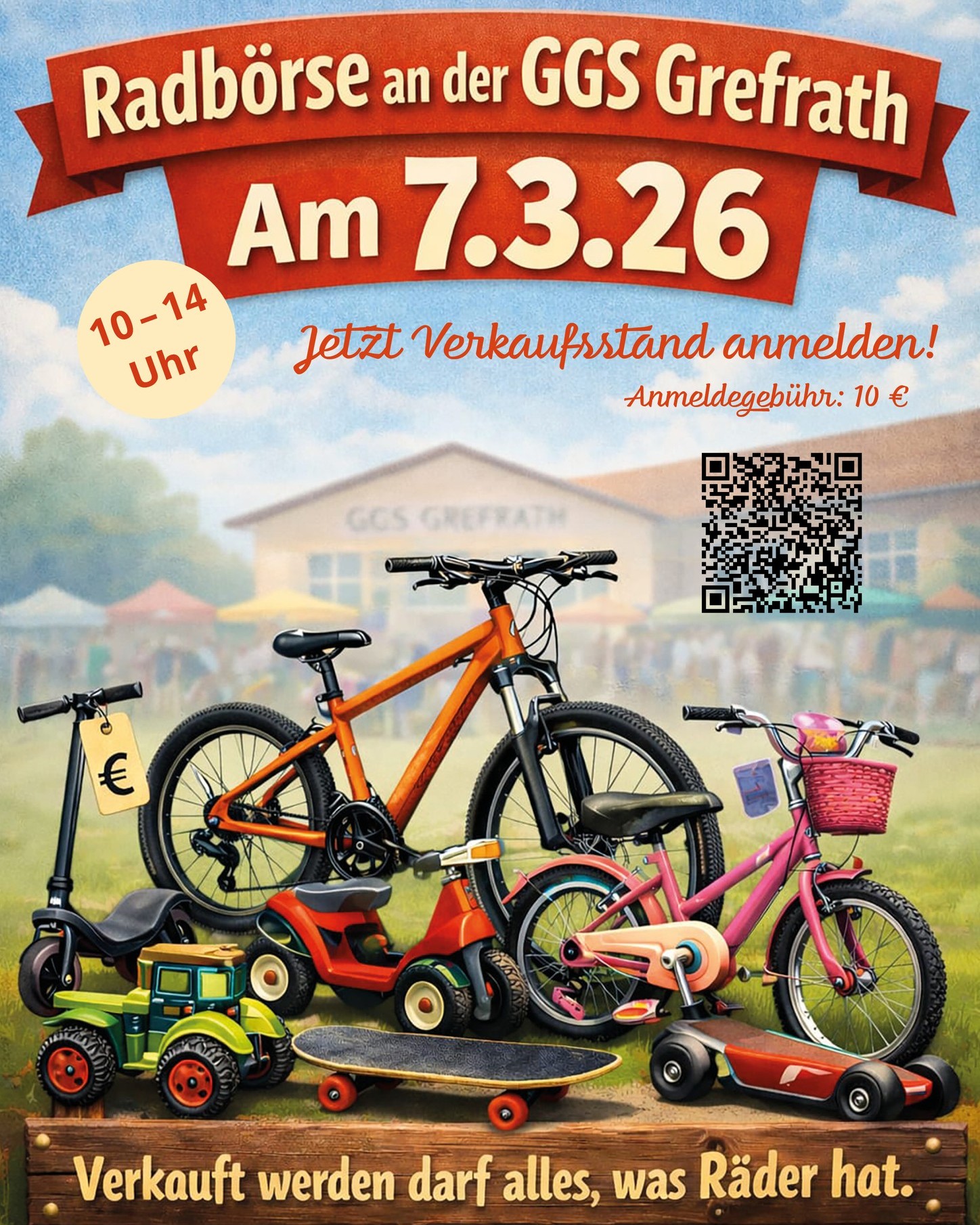 Der Förderverein der Gemeinschaftsgrundschule in Grefrath lädt herzlich zur Fahrradbörse ein.
