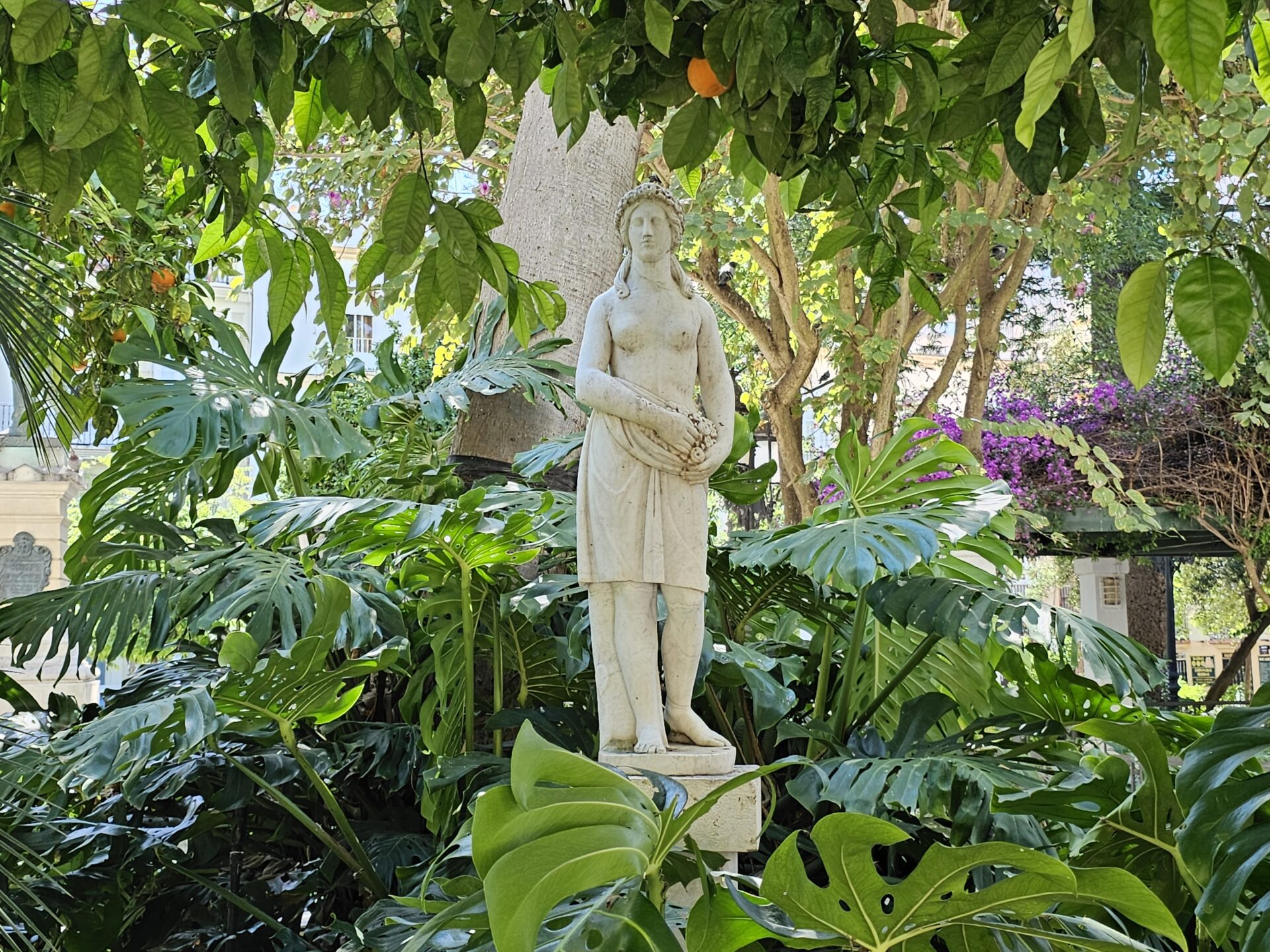 Die Statuen sind in klassisch-römischen Togen gekleidet und stehen auf schlichten, viereckigen Sockeln, wodurch ihre anmutigen Formen besonders zur Geltung kommen. Nach einer sorgfältigen Restaurierung kehrten sie 2009 auf die Plaza zurück – ein Moment, den die Bewohner von Cádiz mit Stolz und Freude feierten. Ein kleiner Irrtum bei der Aufstellung, der zunächst für Verwirrung sorgte, erwies sich später als unbegründet: Die Skulpturen standen von Anfang an am richtigen Ort.