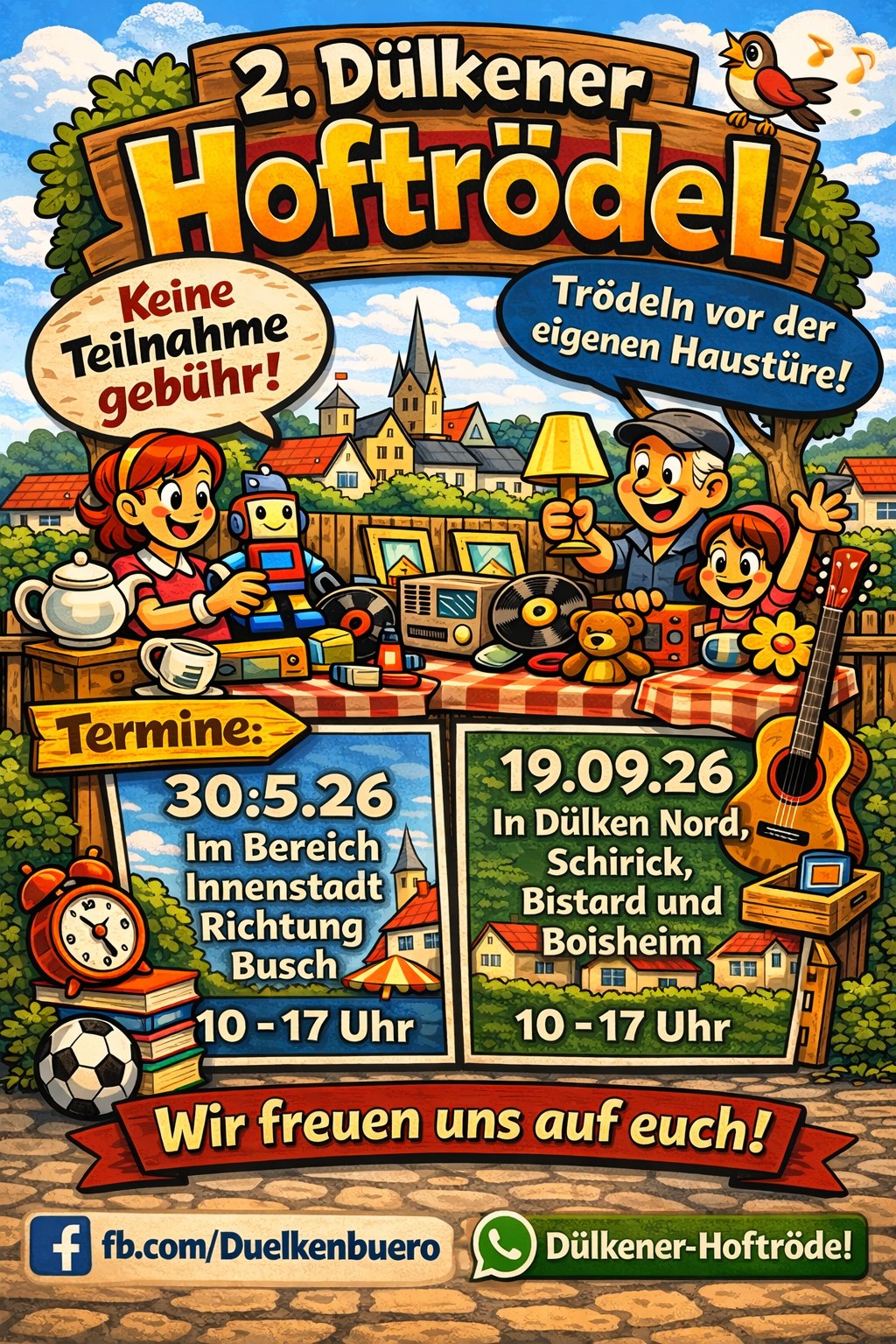 Nach der überwältigenden Premiere im vergangenen Jahr geht der Dülkener Hoftrödel 2026 in die Fortsetzung: Am 30. Mai 2026 lädt Dülken Süd zum Stöbern ein, am 19. September folgen Dülken Nord und Boisheim. Damit knüpfen Stadtteil, Initiatoren und engagierte Bürgerinnen und Bürger an ein Projekt an, das 2025 nicht nur riesige Resonanz fand, sondern Dülken spürbar bewegt hat.