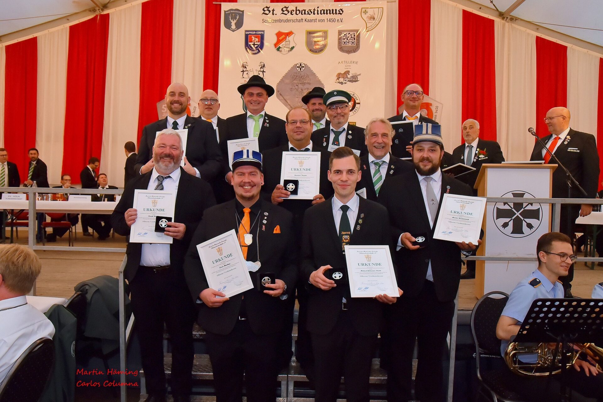 Nach dem feierlichen Einmarsch der Könige, der Generalität und der Majore erfolgte die Übergabe des Regiments an den General durch Claus Schiffer. Die Vorstellung der Majore und ihrer Adjutanten unterstrich einmal mehr die große Verbundenheit und das ehrenamtliche Engagement innerhalb der Bruderschaft. Besondere Höhepunkte des Abends waren die Verleihung des Königsordens von Markus II. Weber sowie weitere Ehrungen, wie etwa das Silberne Verdienstkreuz und die Übergabe von Regimentsorden und dem Diamantschliffabzeichen an verdiente Mitglieder. „Die Atmosphäre war toll – und der Ausklang im Zelt war der perfekte Start ins Fest“, so die einhellige Meinung.