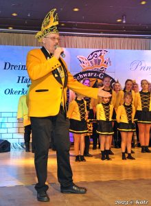 Nach dem gemeinsamen Lied von Prinzenpaar und Kinderprinzenpaar machte Andreas Bottermann Reklame für die anstelle der Seniorensitzung neu ins Leben gerufene Veranstaltung „Kaffeeklatsch und Karneval“, die am 17.02.2023 in der Burggrafenhalle stattfindet.