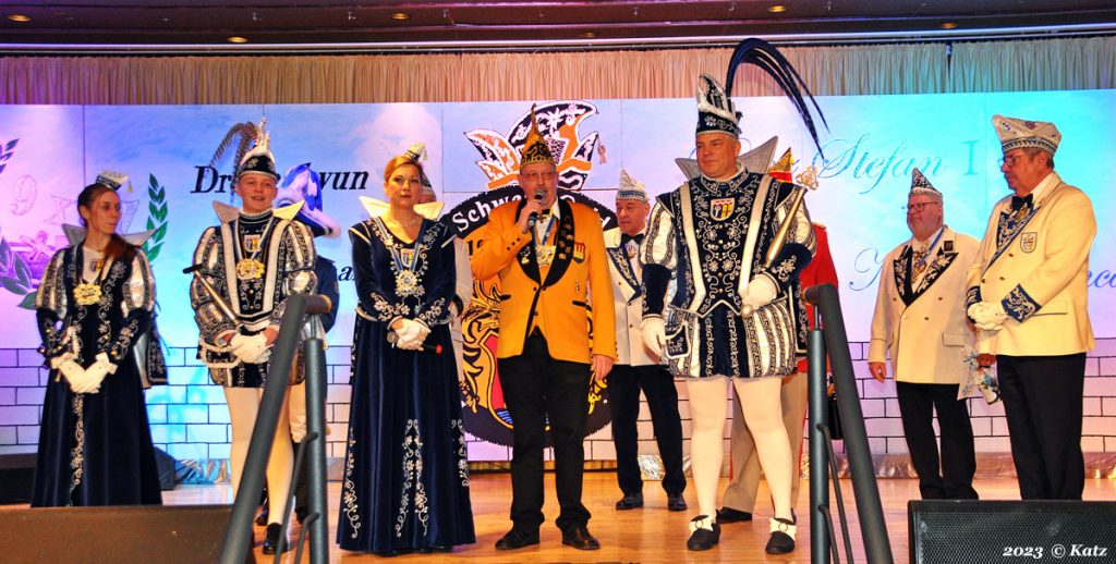 Prinz Stefan und Prinzessin Niersia Bianca waren endlich zu Hause angekommen, in ihrer Gesellschaft. Der Saal ist voll, was will man mehr. Sie waren dankbar, dass viele Gesellschaften der Einladung gefolgt und gekommen waren. Weiter beglückwünschten sie Daniels zu dem hohen Alter von 99 Jahren. Ein besonderes Lob ging an die Tanzgarde, die eine tolle Performance darbietet, synchron tanzt und immer ihr Lächeln zeigt. Immer wenn sie diese Garde sehen, haben sie Tränen in den Augen.