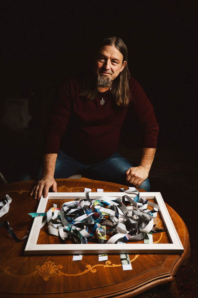 Daniel Borberg begann mit inszenierter Fotografie. Mit dem Erzählen kleiner Geschichten in Bildern, mit dem Wunsch, seine Modelle in andere Rollen schlüpfen zu lassen. Momente festzuhalten, die den Alltag kurz vergessen lassen. Doch mit dem Aufkommen von KI verlor dieses Festhalten an Bedeutung: Bilder sind nun beliebig, austauschbar, fast zu glatt. Statt weiter neue Composings zu bauen, beginnt Daniel, seine eigenen Arbeiten zu zerstören. Er zerschneidet seine Werke, zerlegt erzählte Geschichten und setzt sie als Muster neu zusammen. Heute entsteht daraus Kunst, die KI noch nicht nachmachen kann: handfest, physisch und echt.