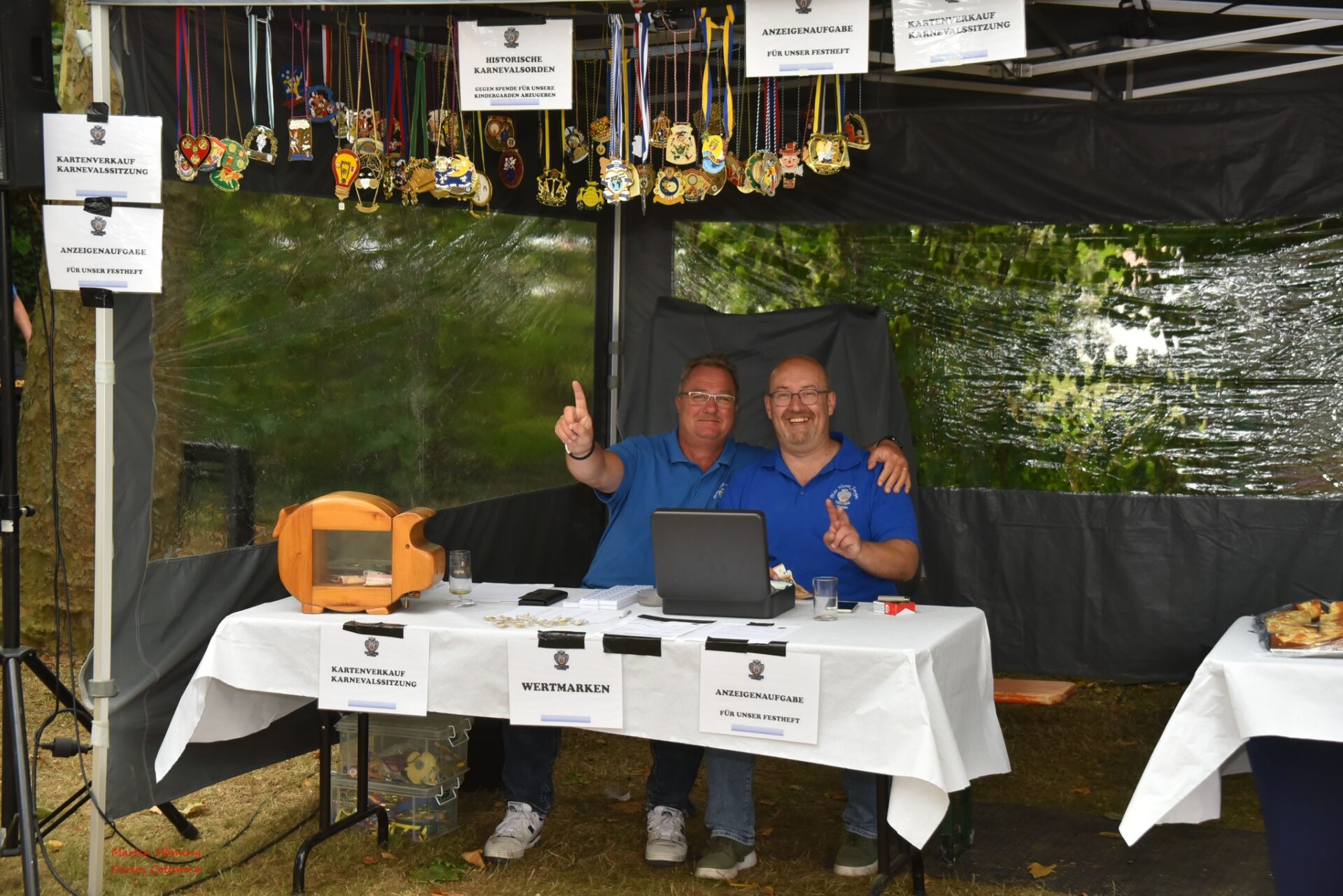 Doch nicht nur die Gegenwart wurde gefeiert: Mitten auf dem Hötte- und Pötte-Platz erinnerte auch die Geschichte an die Wurzeln des Stadtteils. Stelen und Schilder geben Zeugnis von den alten „Hötte“ (Höfen) und „Pötte“ (Dorfbrunnen), die einst das Leben im Bockert möglich machten. Ein wertvolles Stück Heimatgeschichte, das den Festgästen vor Augen führte, wie eng Tradition und Gemeinschaft hier verbunden sind. Zum Ausklang des Tages waren sich alle einig: Dieses Sommerfest war mehr als nur eine närrische Feier der Gesellschaft mit Unterstützern sowie befreundeten Vereinen und ein Hoch auf das jecke Winterbrauchtum.