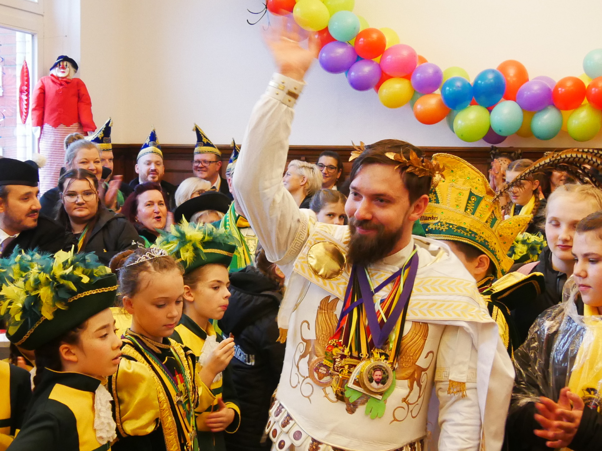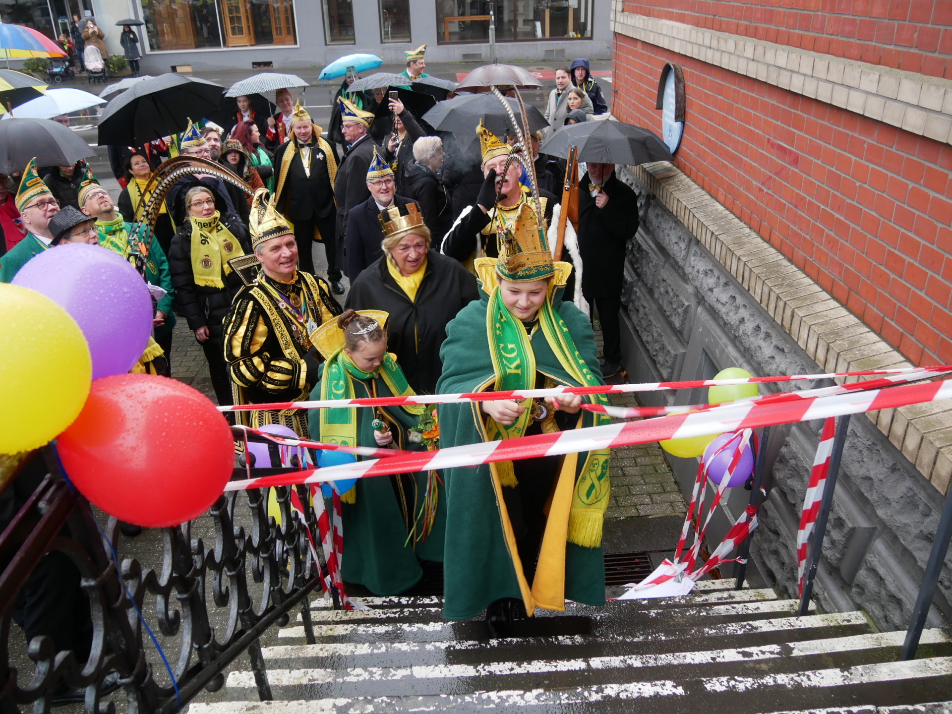 Im Rathaus hatten sich die Verteidiger postiert. Ortsbürgermeister Wolfgang Genenger und der Viersener Beigeordnete Ertunç Deniz stellten sich tapfer der närrischen Übermacht entgegen. In ihren Gesichtern lag ein entschlossenes Lächeln – doch wer genau hinsah, konnte schon das Funkeln der bevorstehenden Kapitulation erkennen. Gegen Dreigestirn, Kinderprinzenpaar, den Bacchus der Friedensstraße und ein ausgelassenes Gefolge war kein Kraut gewachsen.