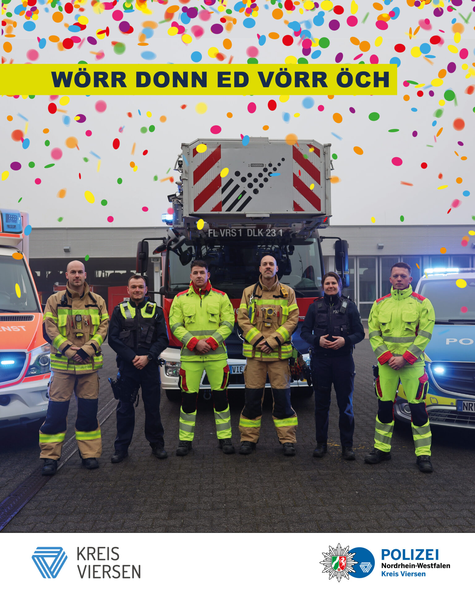 „Wörr donn ed vörr Öch“ – das ist das gemeinsame Motto von Rettungsdienst, Feuerwehr und Polizei im Kreis Viersen für die närrischen Tage. Angelehnt an das aktuelle Motto des Kölner Karnevals sagen auch die Einsatzkräfte im Kreis Viersen: „Wir tun es für Euch.“