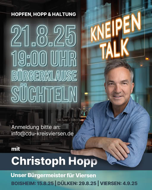 Der Viersener CDU-Bürgermeisterkandidat Christoph Hopp lädt herzlich ein zu einer besonderen Gesprächsreihe in lockerer Atmosphäre – mitten in unseren Stadtteilen, bei einem leckeren Getränk.