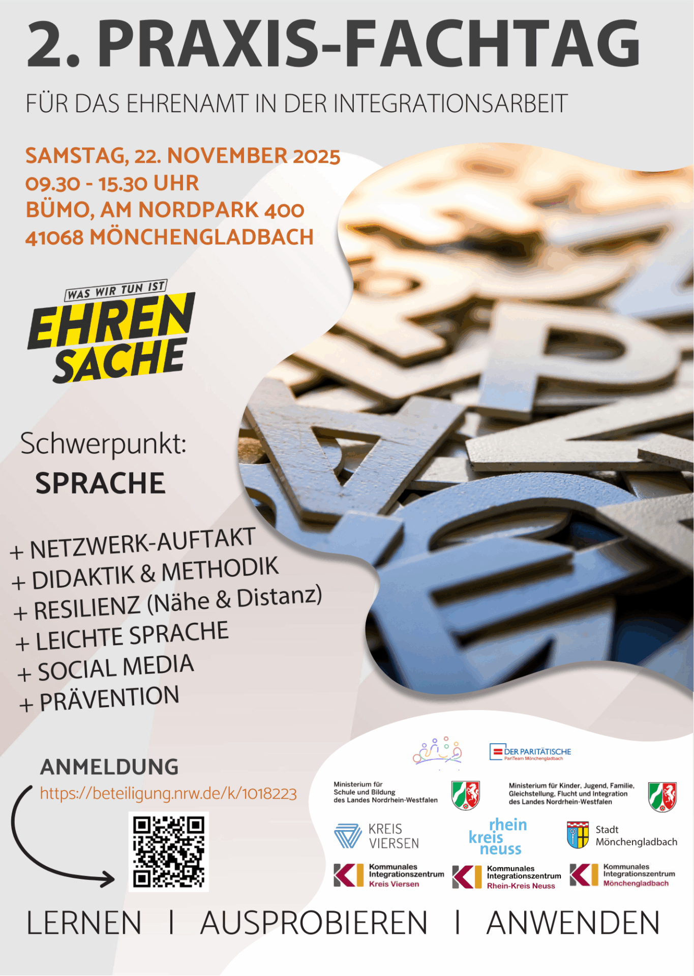 Der zweite Praxis-Fachtag setzt seinen Fokus auf Sprache, Vernetzung und praxisnahe Workshops. Die Veranstaltung richtet sich besonders an ehrenamtlich Engagierte, die niederschwellige Sprachangebote durchführen. Fachkundige Referent*innen stellen in Workshops Inhalte zu Vernetzung mit einem Netzwerk Auftakt, Didaktik und Methodik, Resilienz mit Nähe und Distanz, Leichter Sprache, Social Media und Prävention vor.