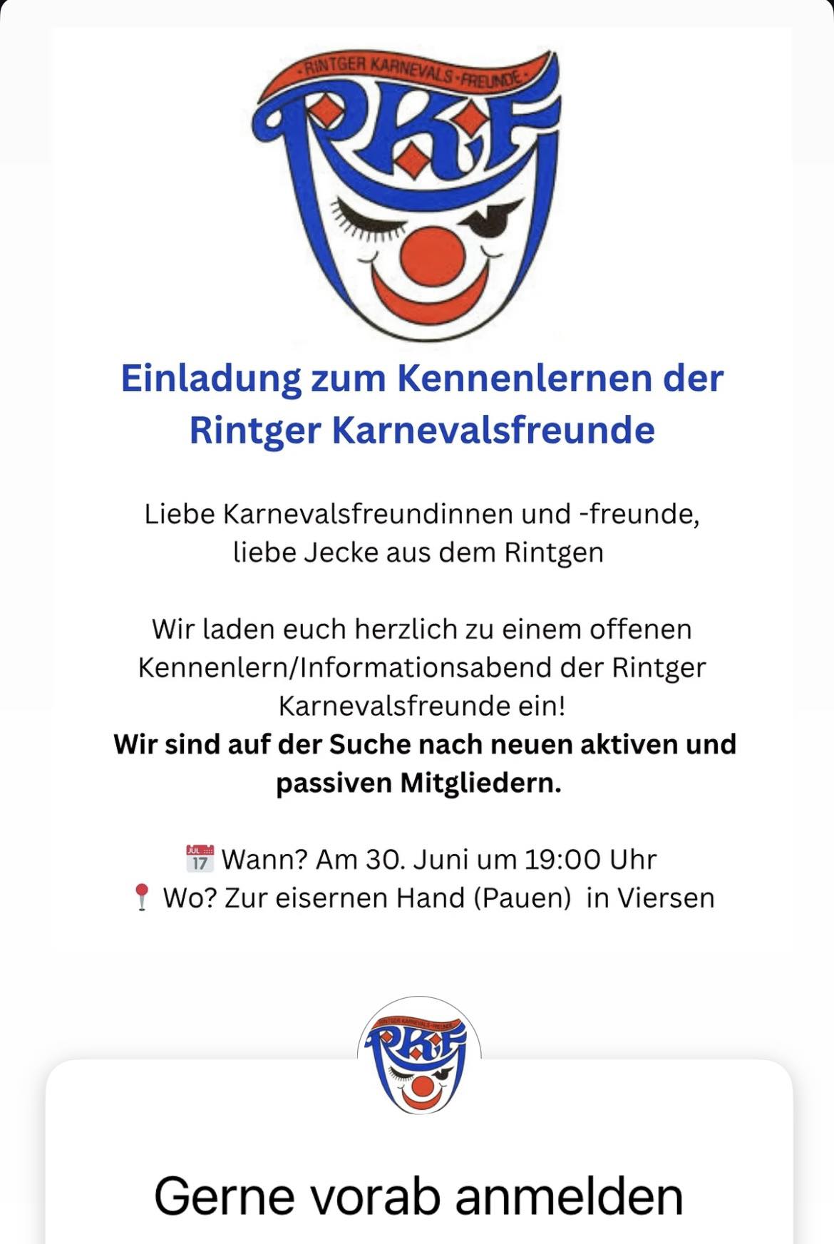 Unter dem Motto „Jeck sein verbindet!“ laden die Rintger Karnevalsfreunde alle Interessierten herzlich zu einem offenen Kennenlern- und Informationsabend ein. Die Veranstaltung findet am 30. Juni, um 19:00 Uhr, im Lokal Pauen/Zur eisernen Hand in Viersen statt.