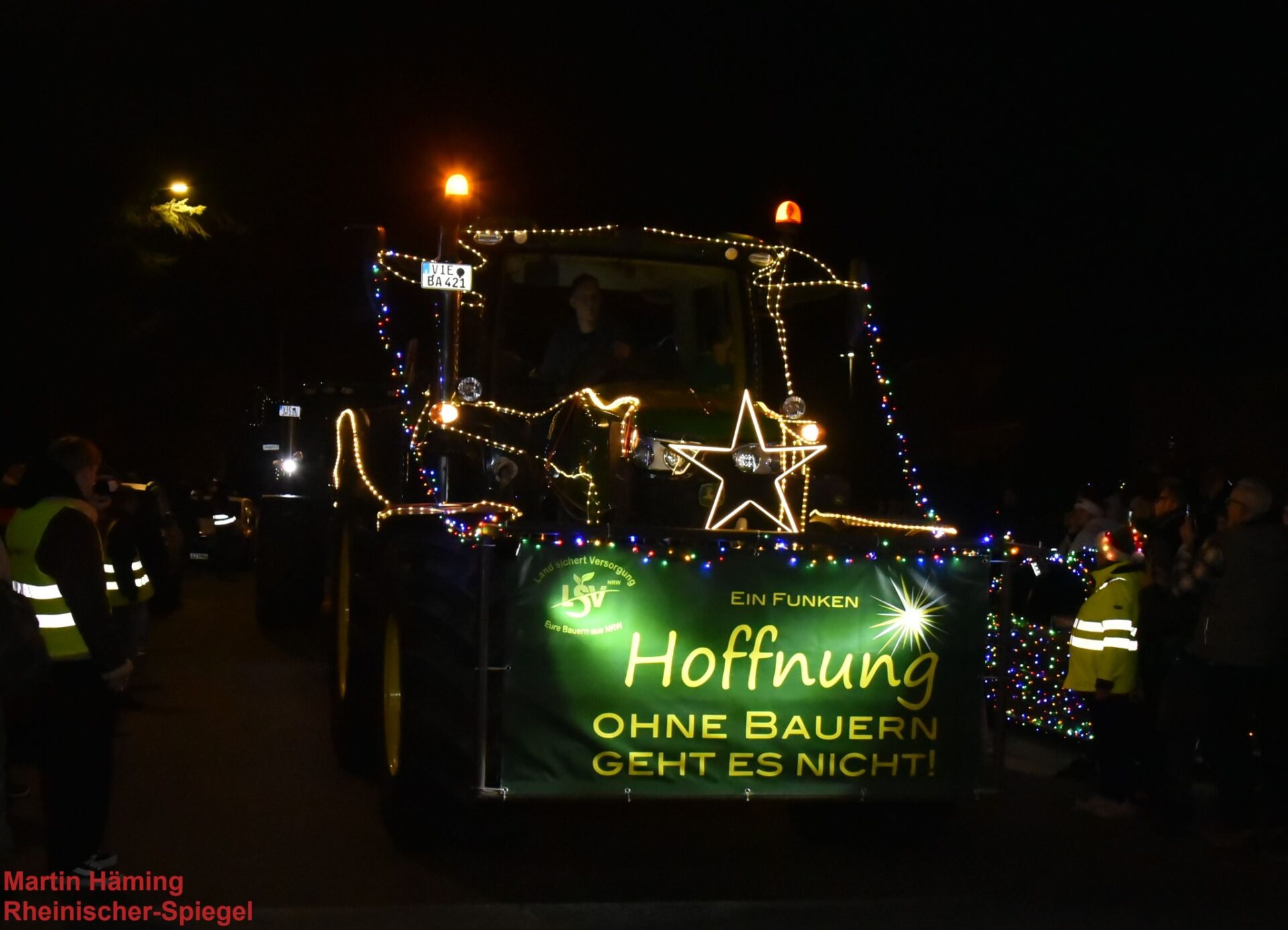Doch der absolute Blickfang des Abends war eine der längsten Lichterfahrten der Landwirte in Nordrhein-Westfalen, die mit „einem Funken Hoffnung“ auch in diesem Jahr wieder auf ihre Situation aufmerksam machen wollten. Politische Entscheidungen nicht zu Gunsten der Landwirte, ein wachsender Druck durch ausländische Erzeugnisse, steigende Kosten – ihr Hilferuf sollte weit über die Straßen hinweg gehört werden.