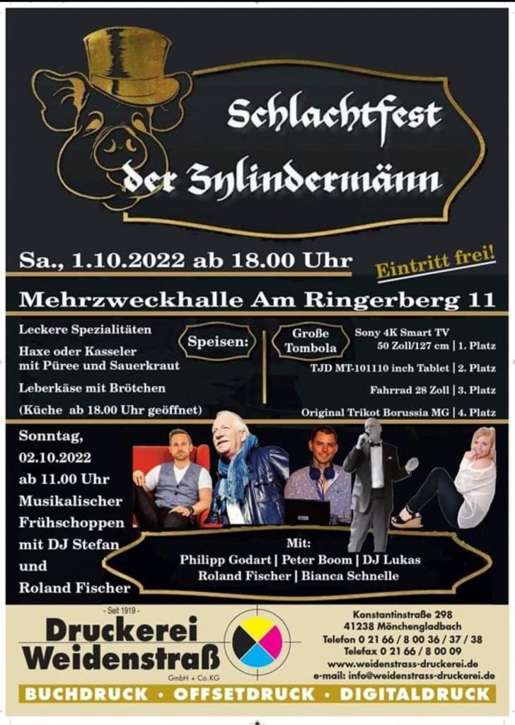 Mönchengladbach – Endlich hat nun die der Corona-Pandemie geschuldete Zwangspause ein Ende: Am Samstag, 1. Oktober 2022, laden die Zylindermänn Waldhausen ab 18.00 Uhr bei freiem Eintritt zu ihrem traditionellen Schlachtfest in die Mehrzweckhalle Am Ringerberg ein. Und wer von der guten Stimmung bei den Zylindermänn nicht genug bekommen kann, dem sei an gleicher Stelle der Musikalische Frühschoppen am 2. Oktober 2022 um 11.00 Uhr ans Herz gelegt.