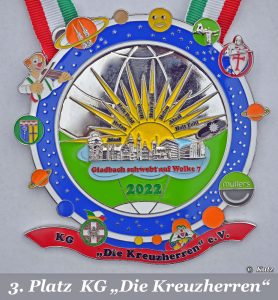 Über der Skyline von Gladbach geht die Sonne auf und strahlt mit vielen Schlachtrufen, abgebildet in den Strahlen der Sonne, hinaus in die Welt.Im Orden der Kreuzherren stellt sie Gladbach als Zentrum des Brauchtums, Zentrum der Jecken, Zentrum im karnevalistischen Weltall vor.