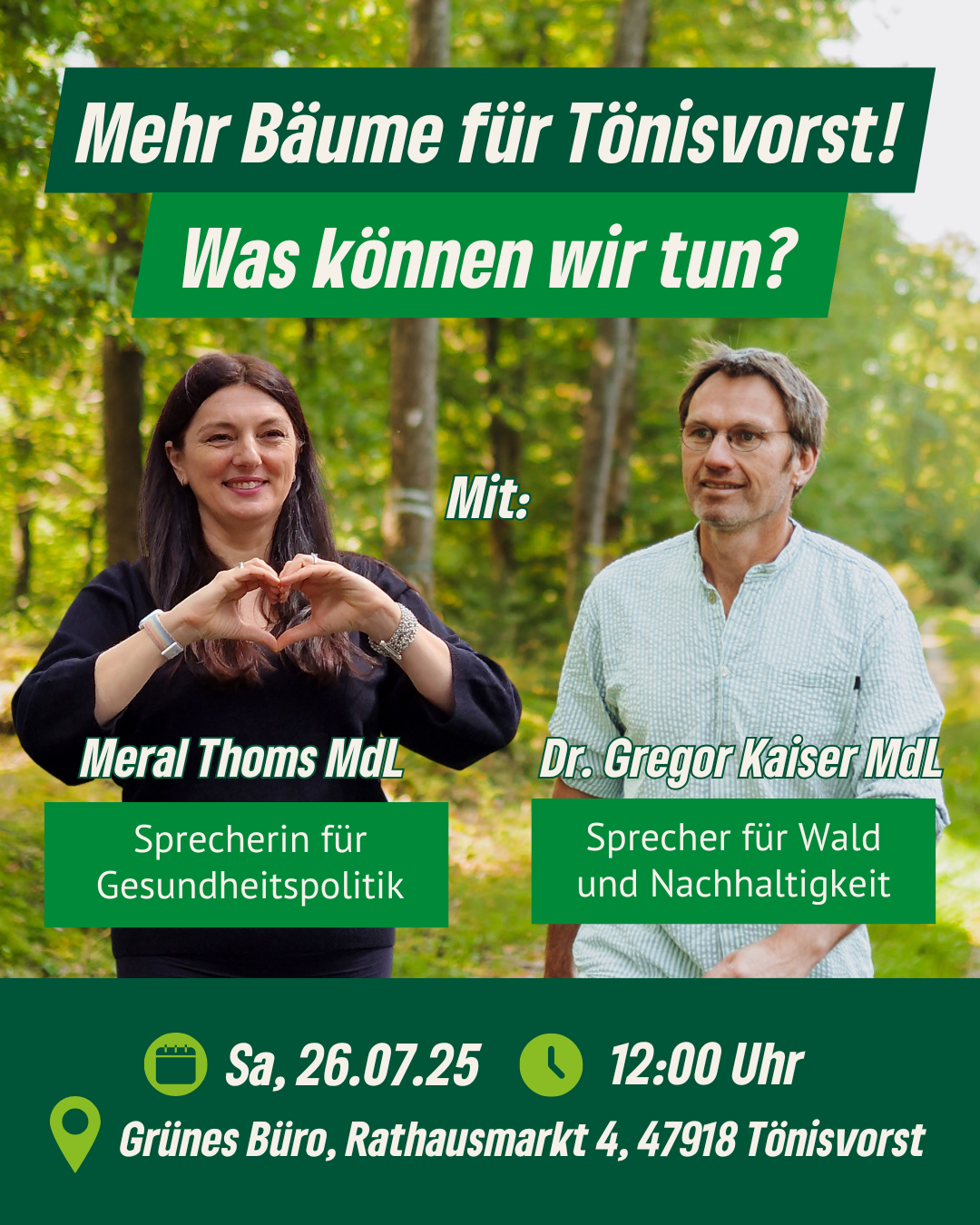 Dabei geht es auch um konkrete politische Instrumente: Die Grüne Fraktion setzt sich für die Einführung einer Baumschutzsatzung ein, die auch auf privaten Grundstücken alte, besonders wertvolle Bäume schützt.