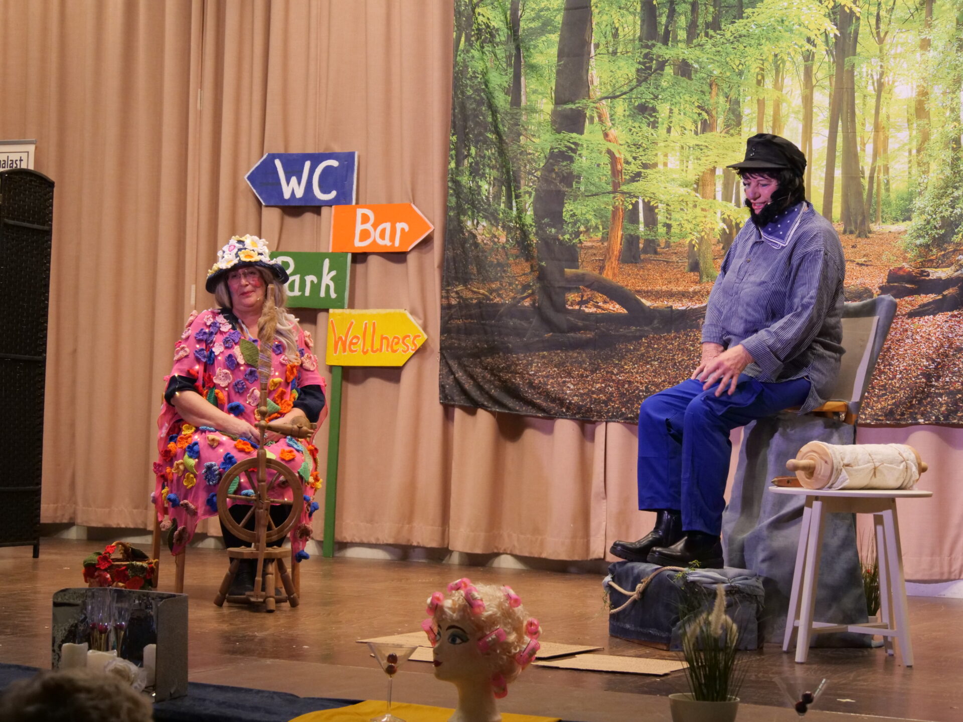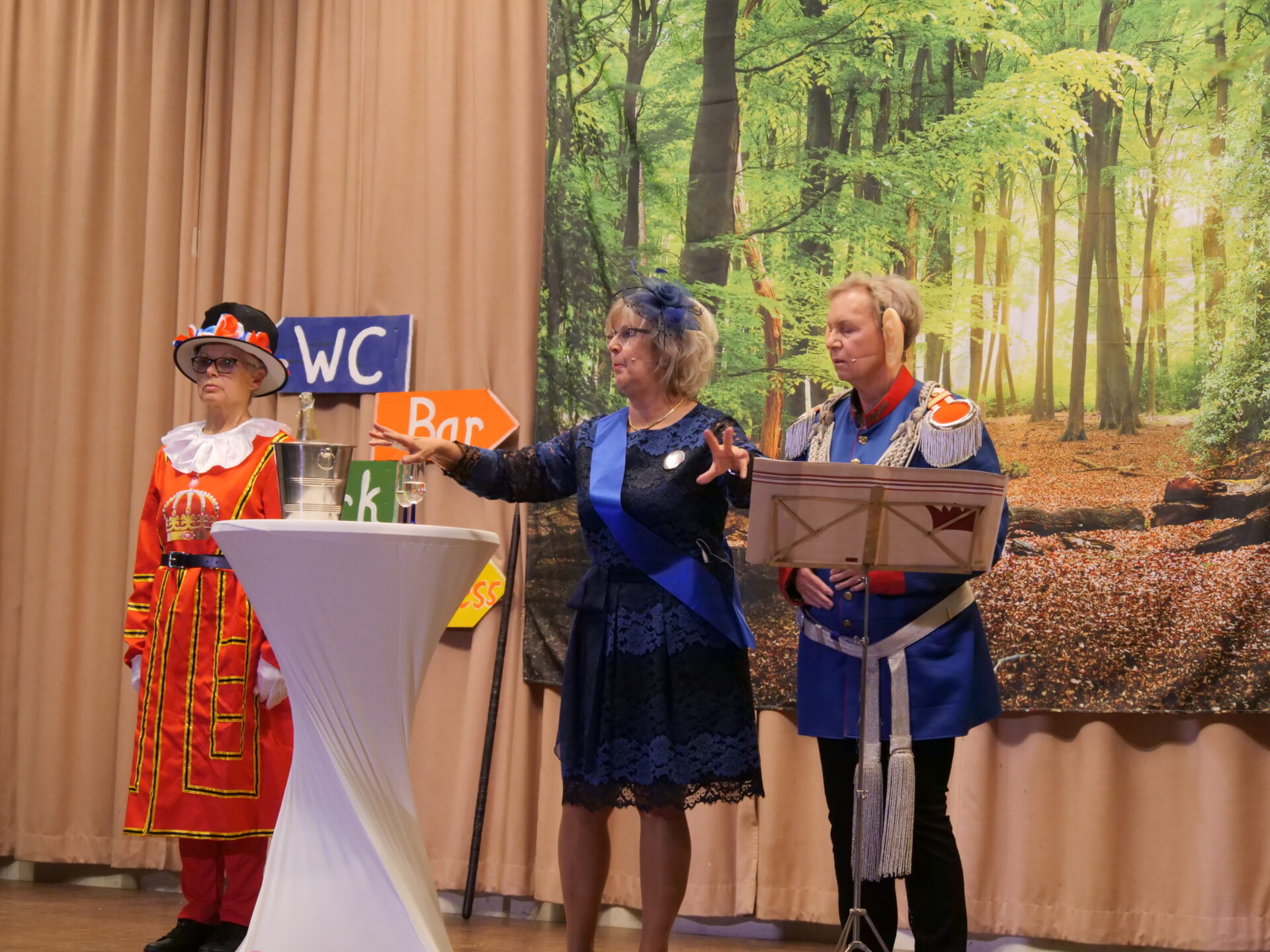 Zwischen den Wohlfühlmomenten stolperten die Darstellerinnen in herrlich überzeichnete Katastrophen. Plötzlich erschien sogar königlicher Besuch: Der König von England samt Gemahlin gab sich die Ehre, um die historischen Ausgrabungen Süchtelns zu bestaunen. In einer weiteren Szene schwebte der Weber vom Brunnen – samt seiner Frau am Spinnrad – direkt aus dem Himmel auf die Bühne. In einem komischen Wortgefecht nahm er sich der Süchtelner Dauerbaustellen an und wunderte sich lautstark über deren zähen Fortschritt. Auch eine Anspielung auf Nachtwächter Heinz Prost durfte nicht fehlen – verbunden mit dem Versprechen, ihn im kommenden Jahr kurzerhand selbst mitzubringen.